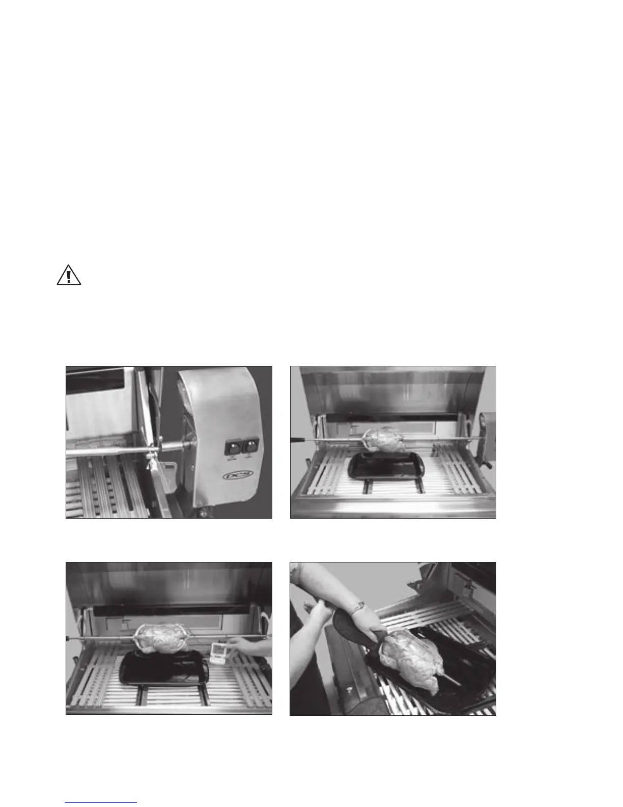 3. Ignite burner, start rotisserie motor. Turn the control knob to the desired setting for cooking the meat.