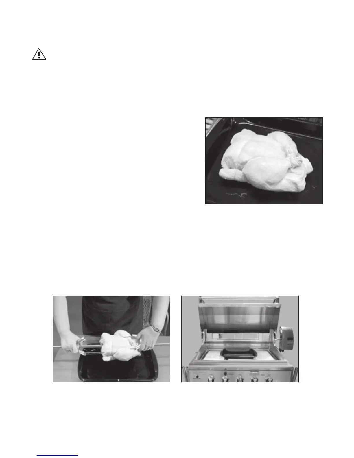N’allumez jamais les brûleurs du gril (brûleurs inférieurs) lorsque vous utilisez la rôtissoire. Cela brûlerait la viande et