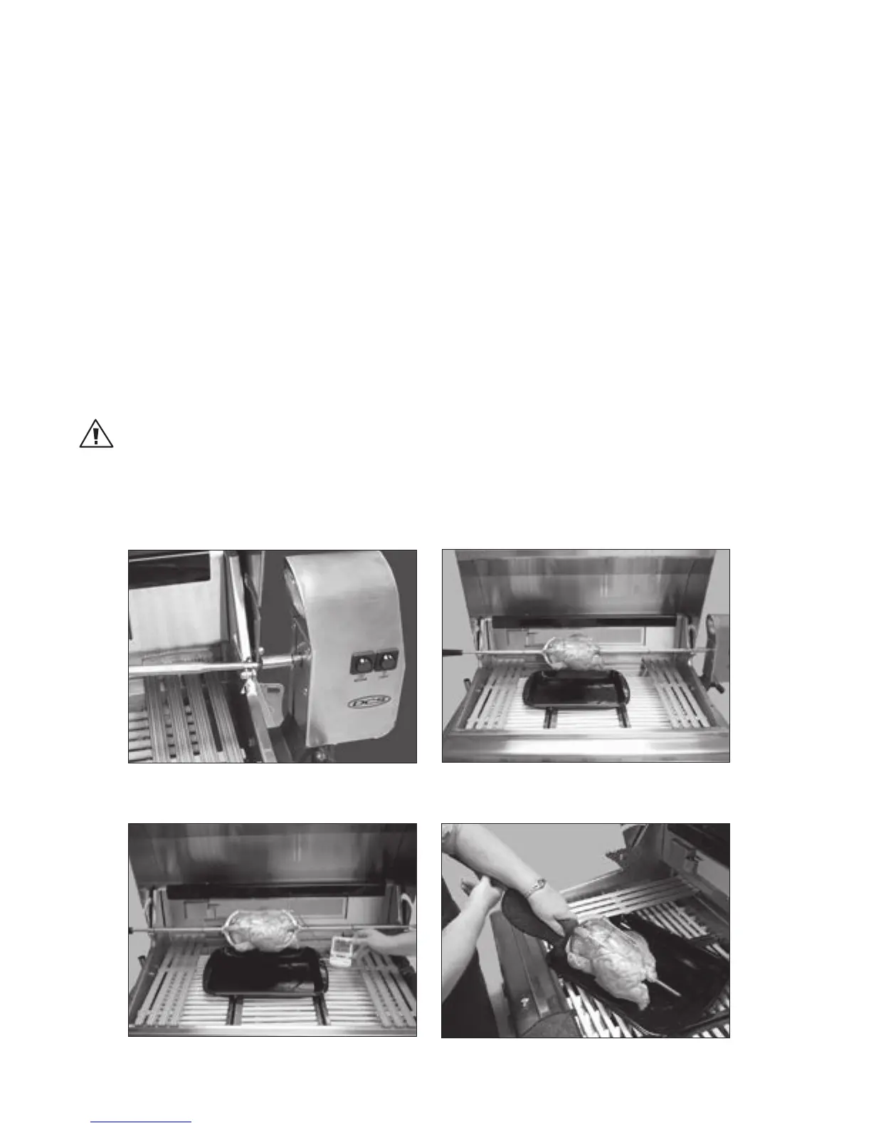 6. Retirez le tournebroche; utilisez les poignées isolantes et placez la viande ou la volaille sur le fond de la lèchefrite,