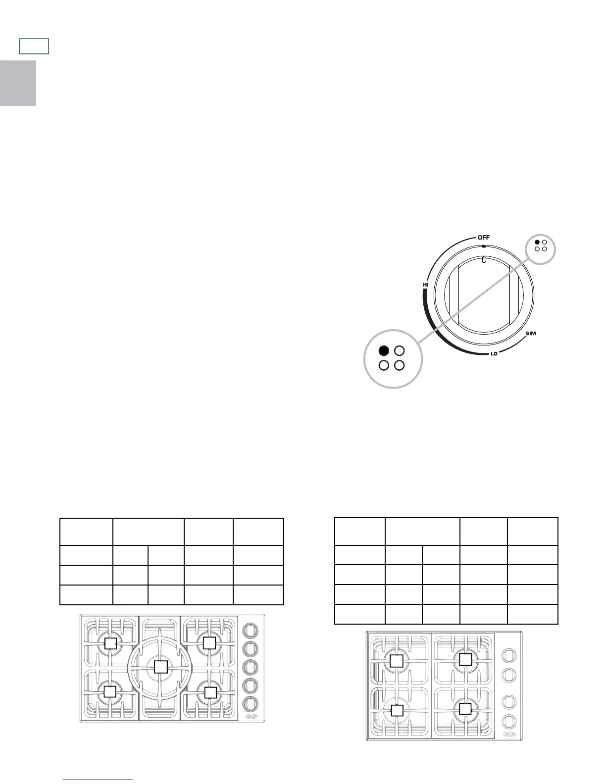 tween HI and SIM (with the exception of LO). To light a burner, push its control knob in and rotate counterclock-