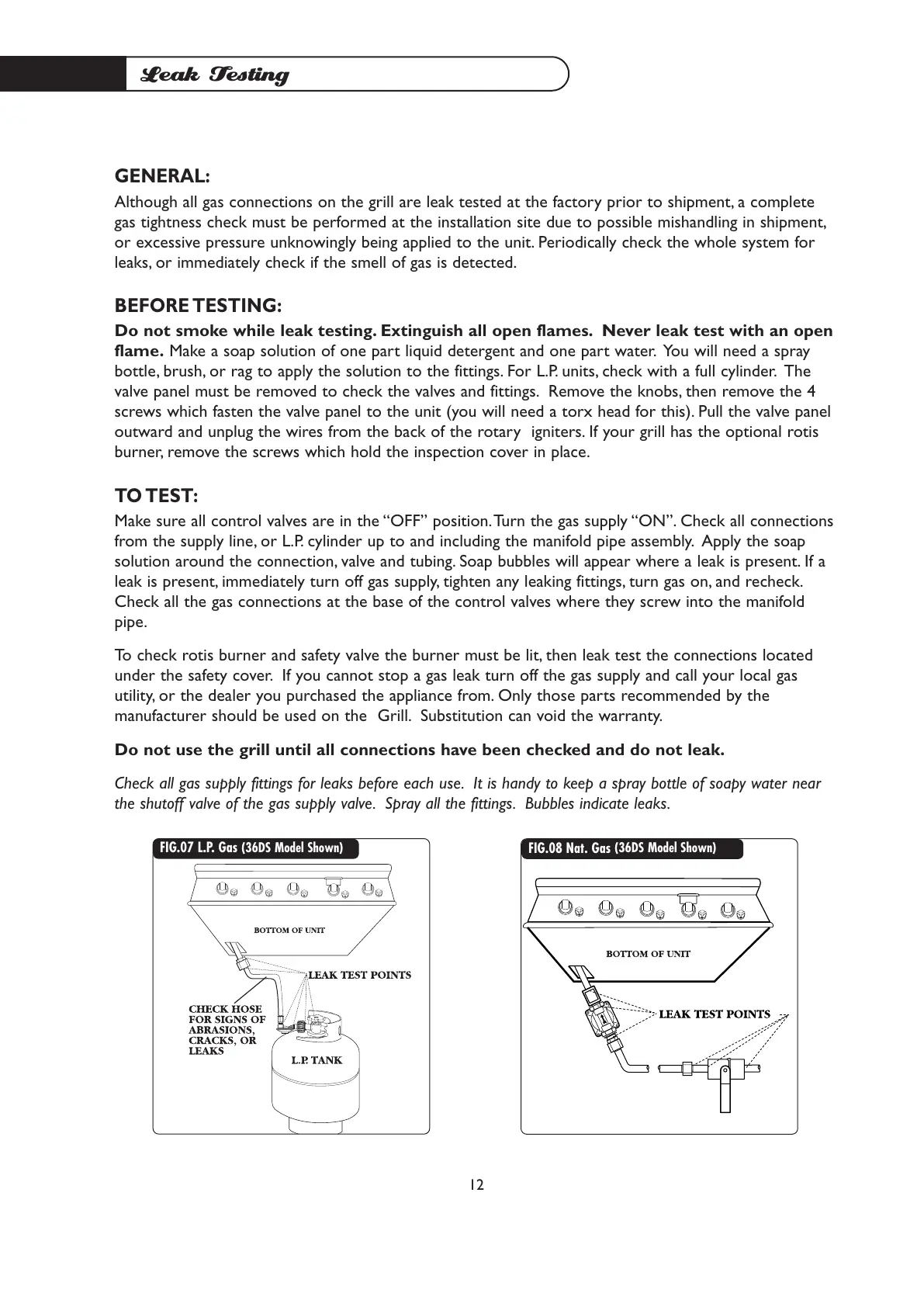 Although all gas connections on the grill are leak tested at the factory prior to shipment, a complete
