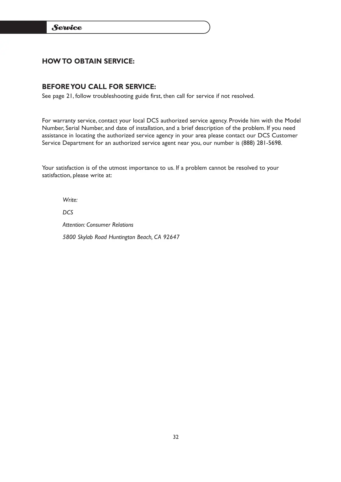 For warranty service, contact your local DCS authorized service agency. Provide him with the Model