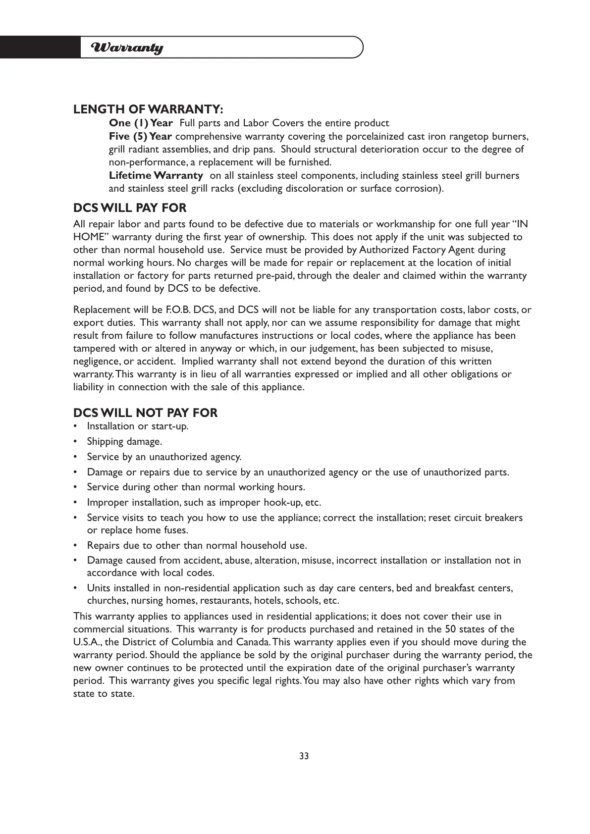 commercial situations. This warranty is for products purchased and retained in the 50 states of the