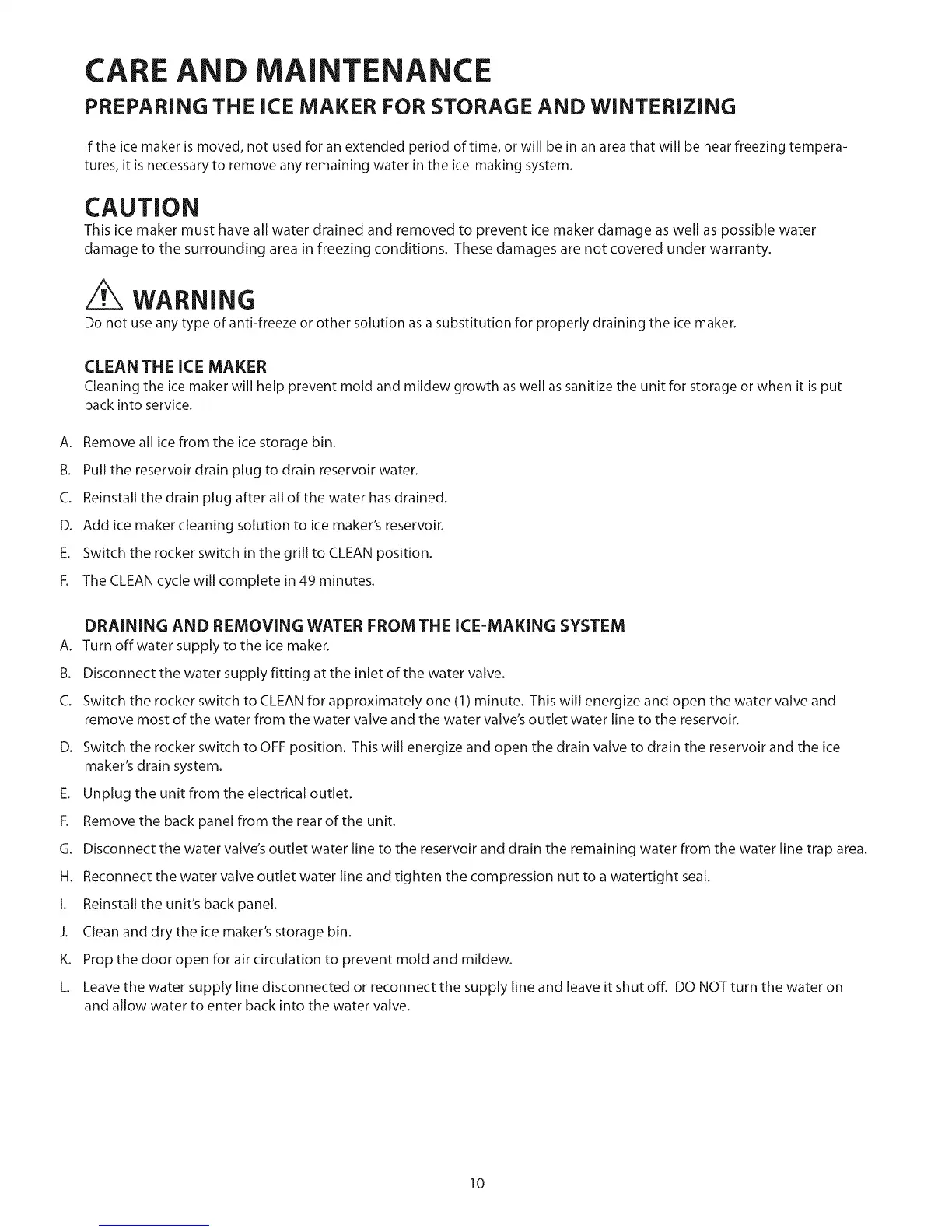 Do not use any type of anti-freeze or other solution as a substitution for properly draining the ice maker.