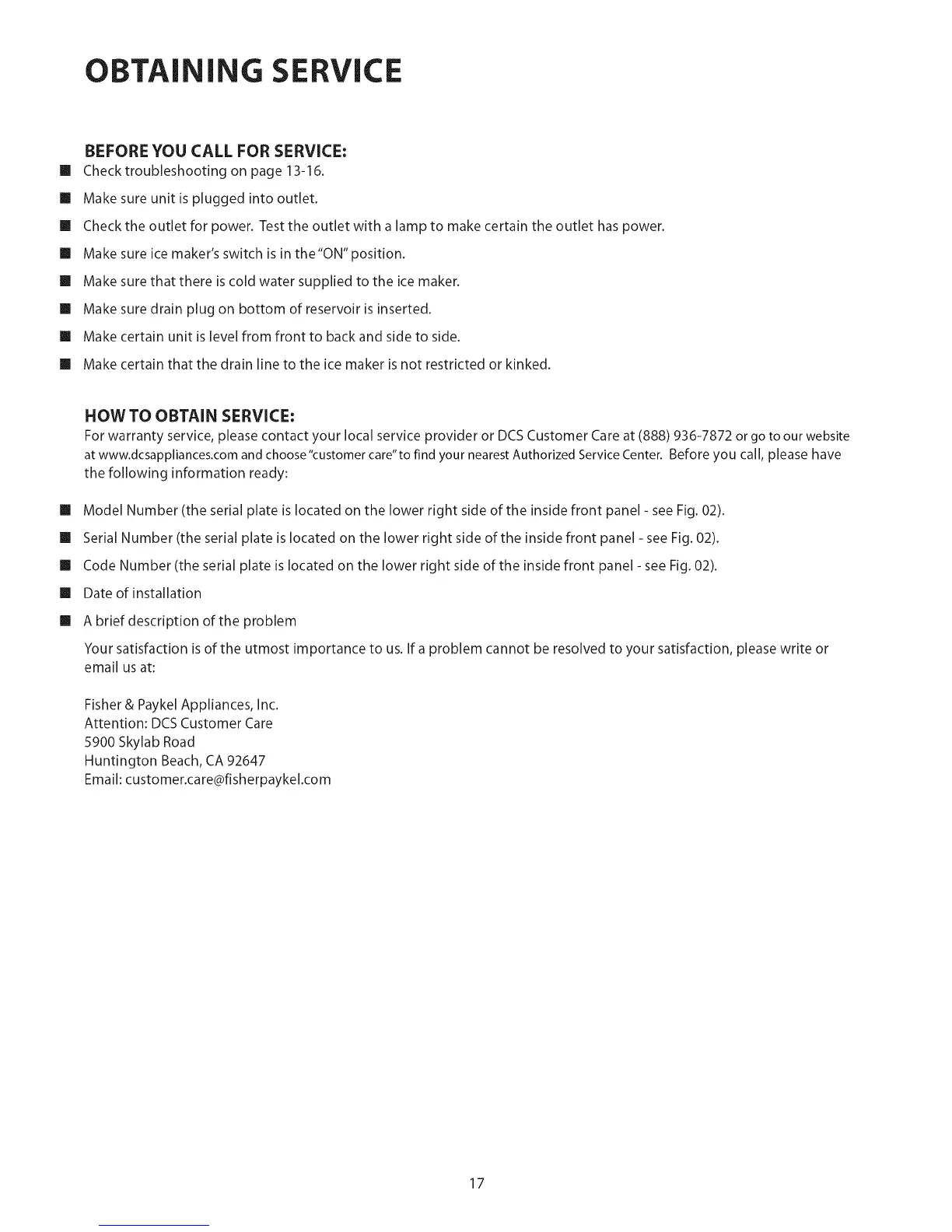 at www.dcsappliances.com and choose"customer care"to find your nearest Authorized ServiceCenter. Before you call, please have