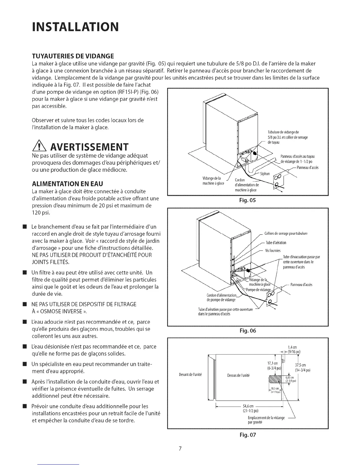 La maker _ glace utilise une vidange par gravit6 (Fig. 05) qui requiert une tubulure de 5/8 po D.I. de I'arri_re de la maker