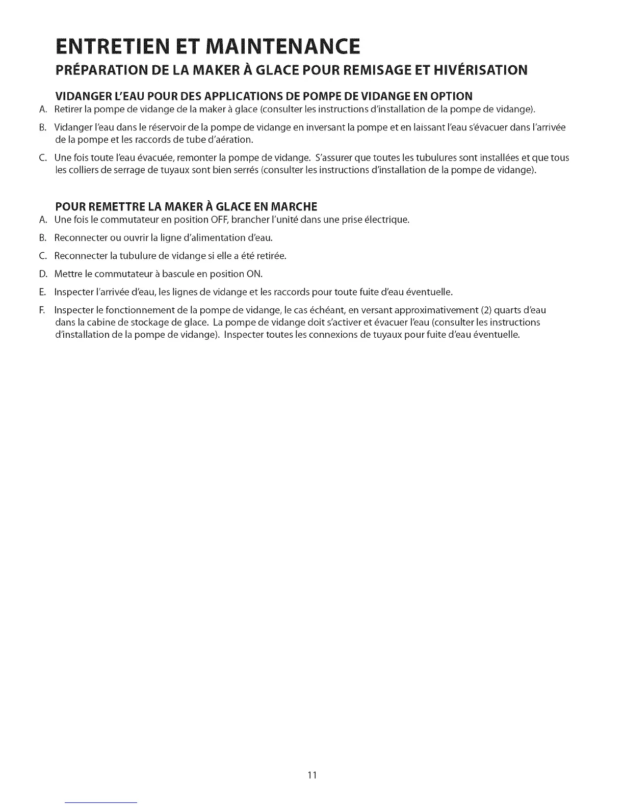 dans la cabine de stockage de glace. La pompe de vidange doit s'activer et 6vacuer I'eau (consulter les instructions