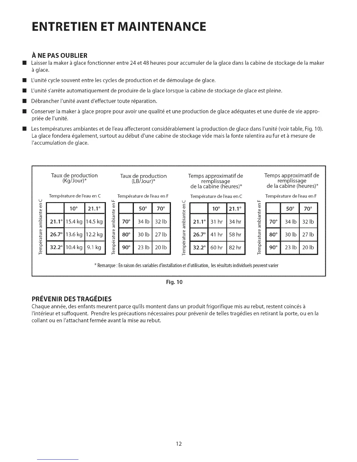 [] Lestemperatures ambiantes et de I'eau affecteront consid_rablement la production de glace dans I'unit_ (voir table, Fig. 10).
