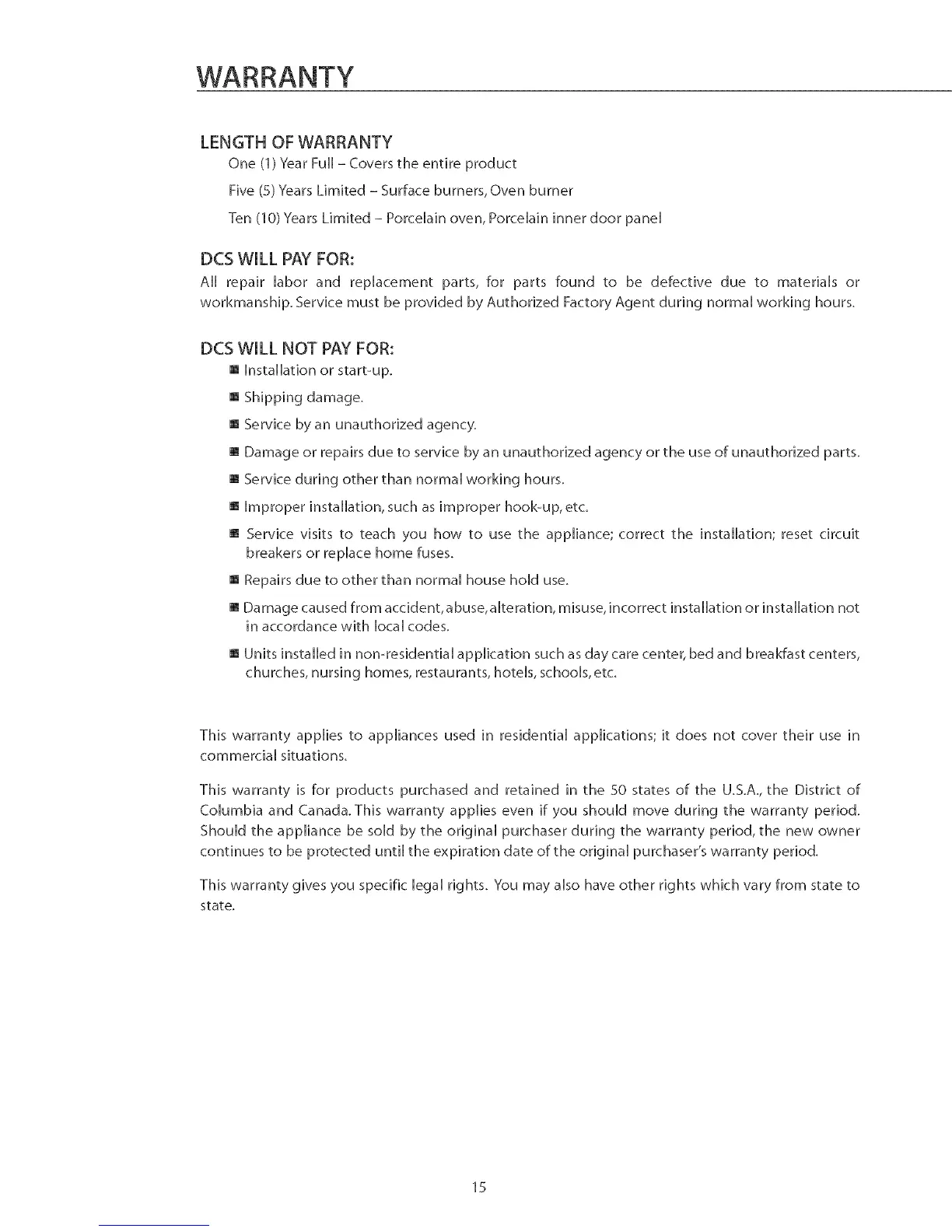 This warranty applies to appliances used in residential applications; it does not cover their use in