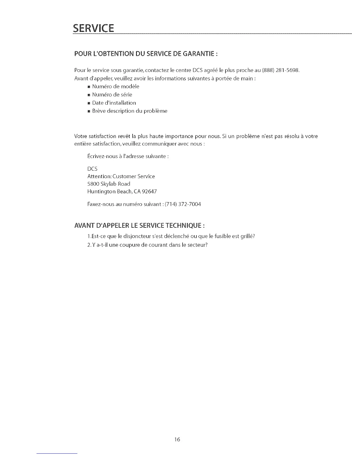 Pour [e service sous garantie, contactez [e centre DCS agr_ [e plus proche au (888) 281-5698.