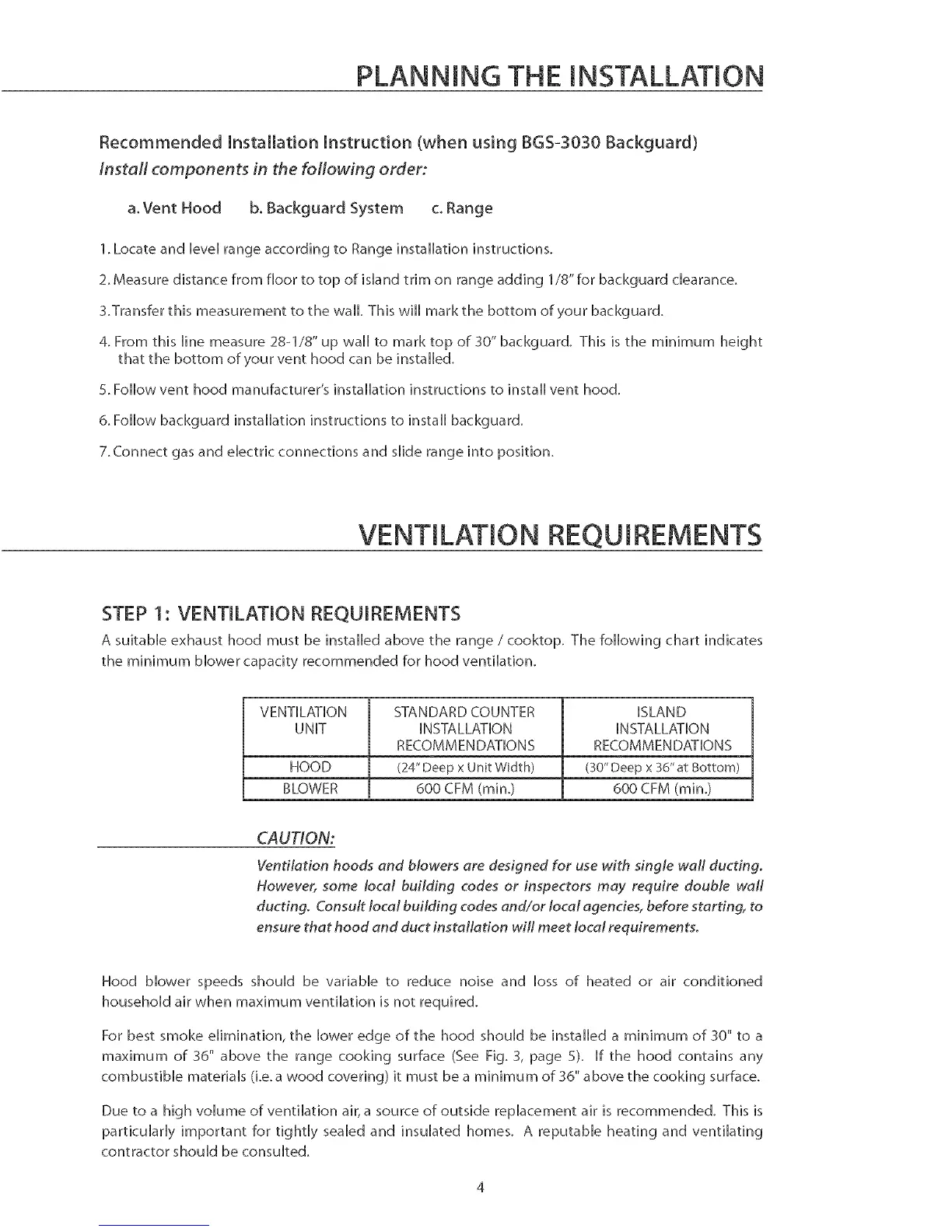 A suitable exhaust hood must be installed above the range / cooktop. The following chart indicates