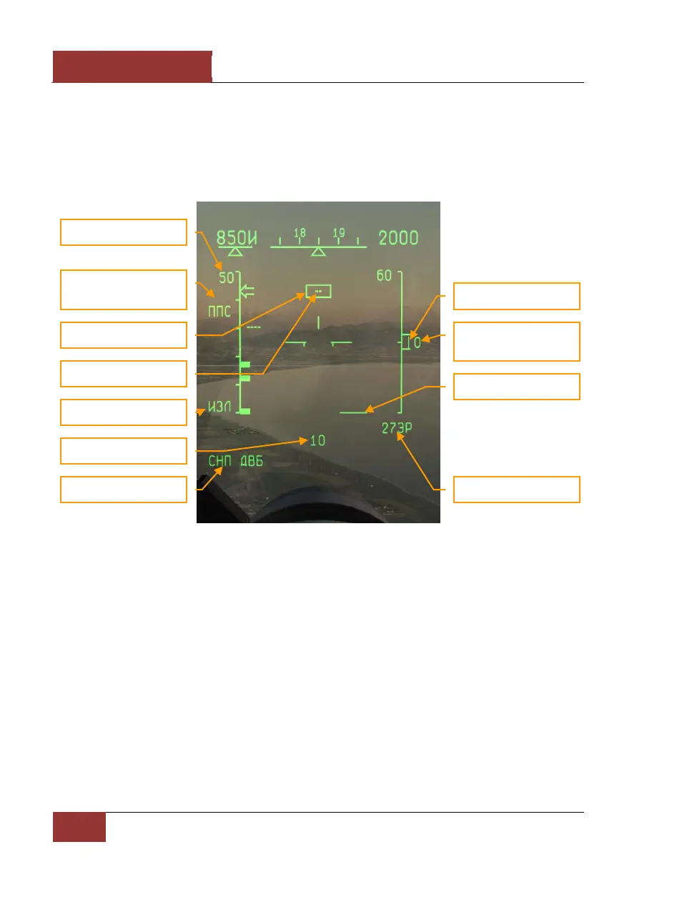 The HUD symbology in "СНП" (TWS) mode is similar to that of "ОБЗ" (SCAN) mode.