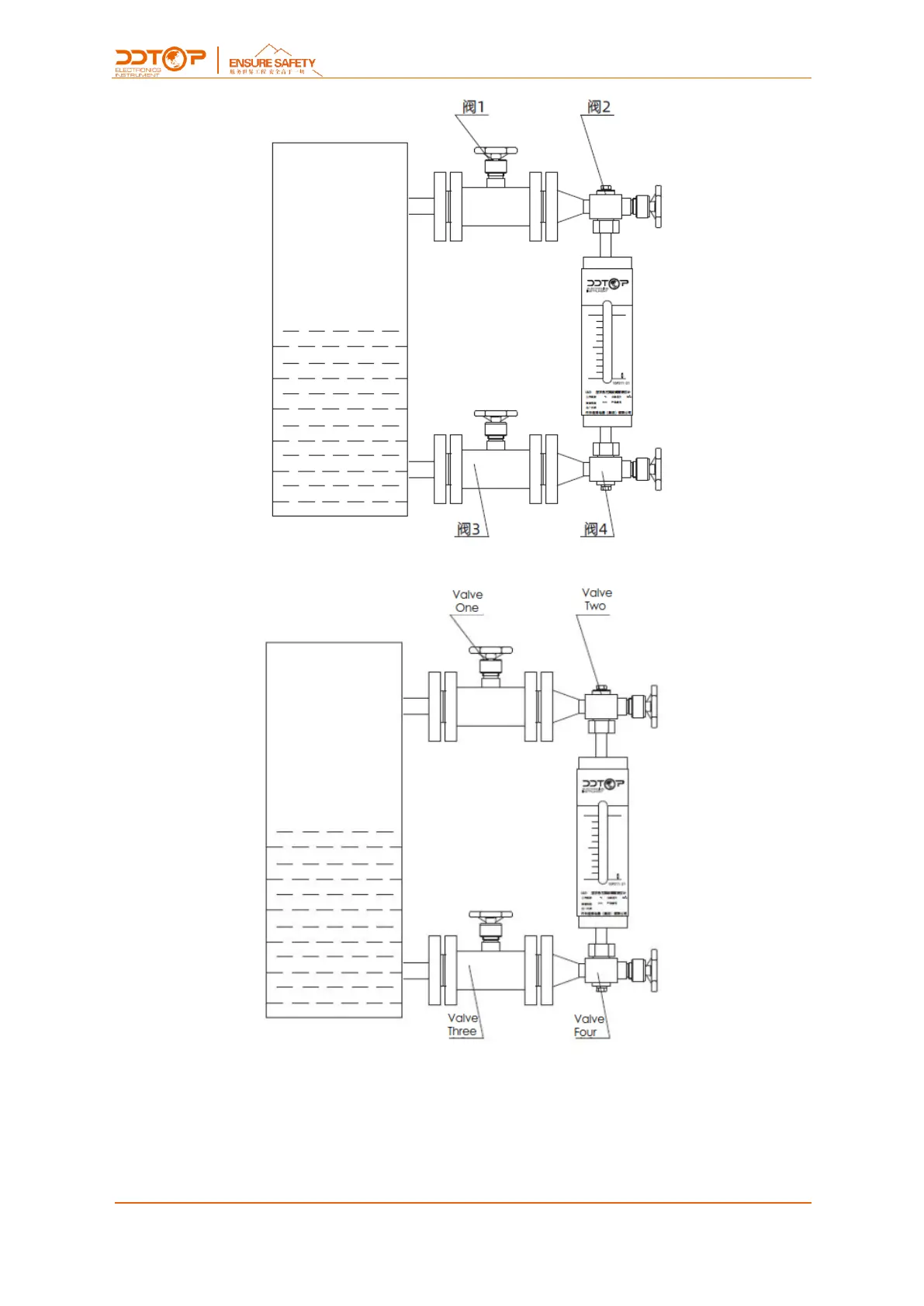 7.1 完全关闭液位计上的全部阀门( 1- 4)