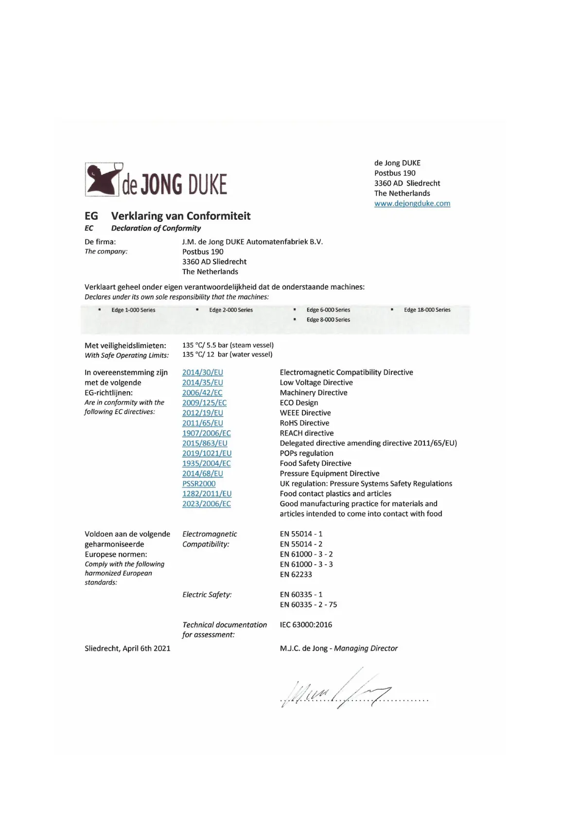 de Jong Duke Edge - Declaration of Conformity
