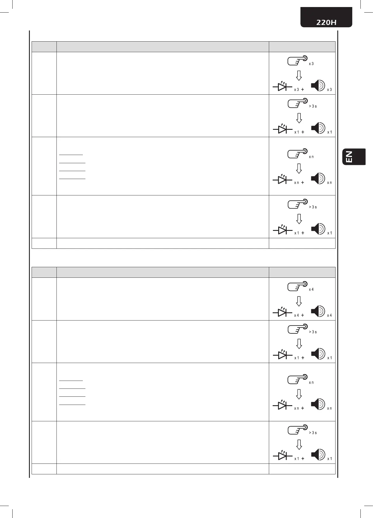 3 pressures -> Timed (3 blinks and 3 acoustic warnings)