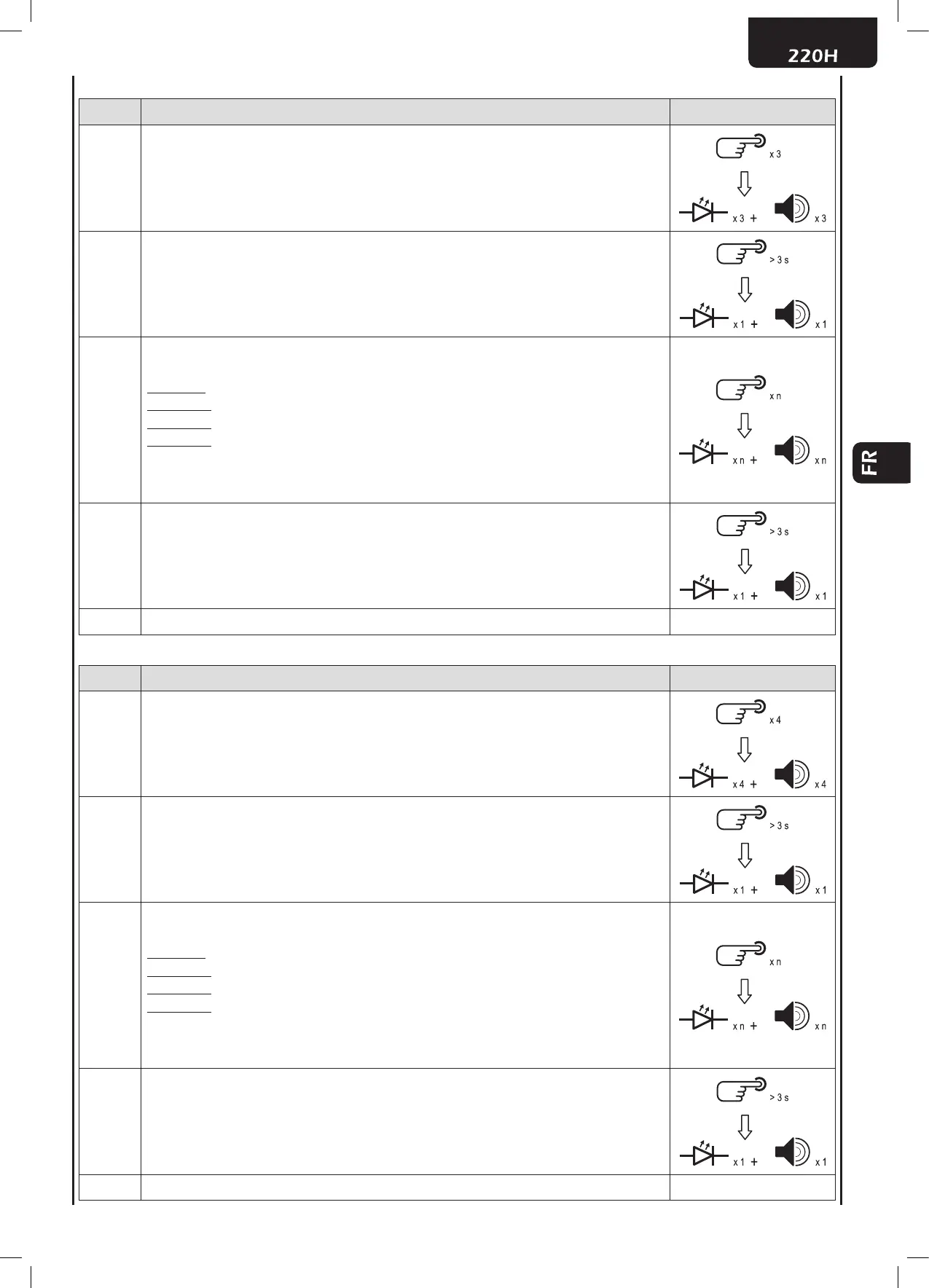 ments (rapides) de la Led et de signaux sonores correspondant à la fonction sélectionnée toutes
