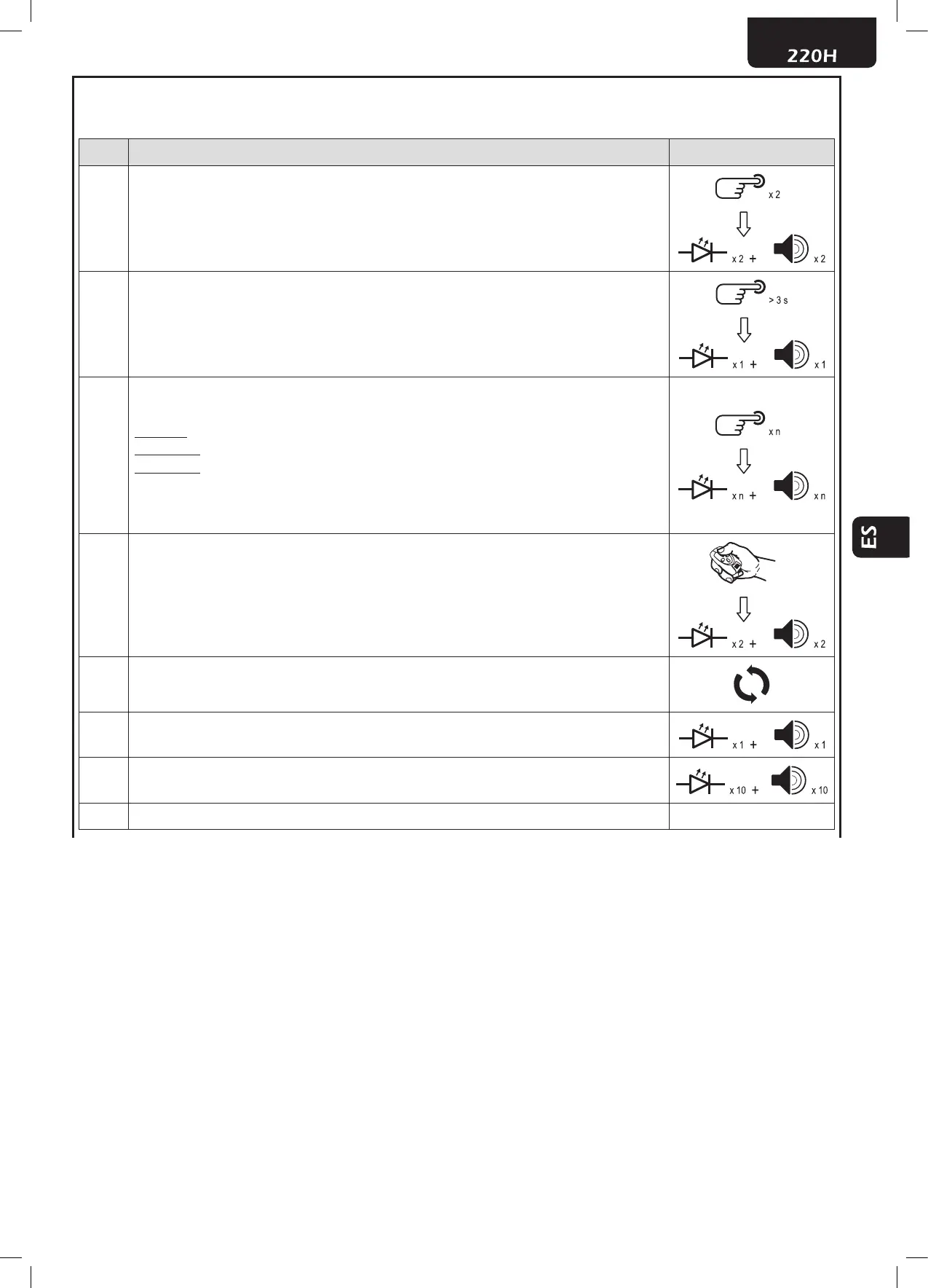 2 presiones -> salida 2 (2 parpadeos y 2 avisos acústicos)