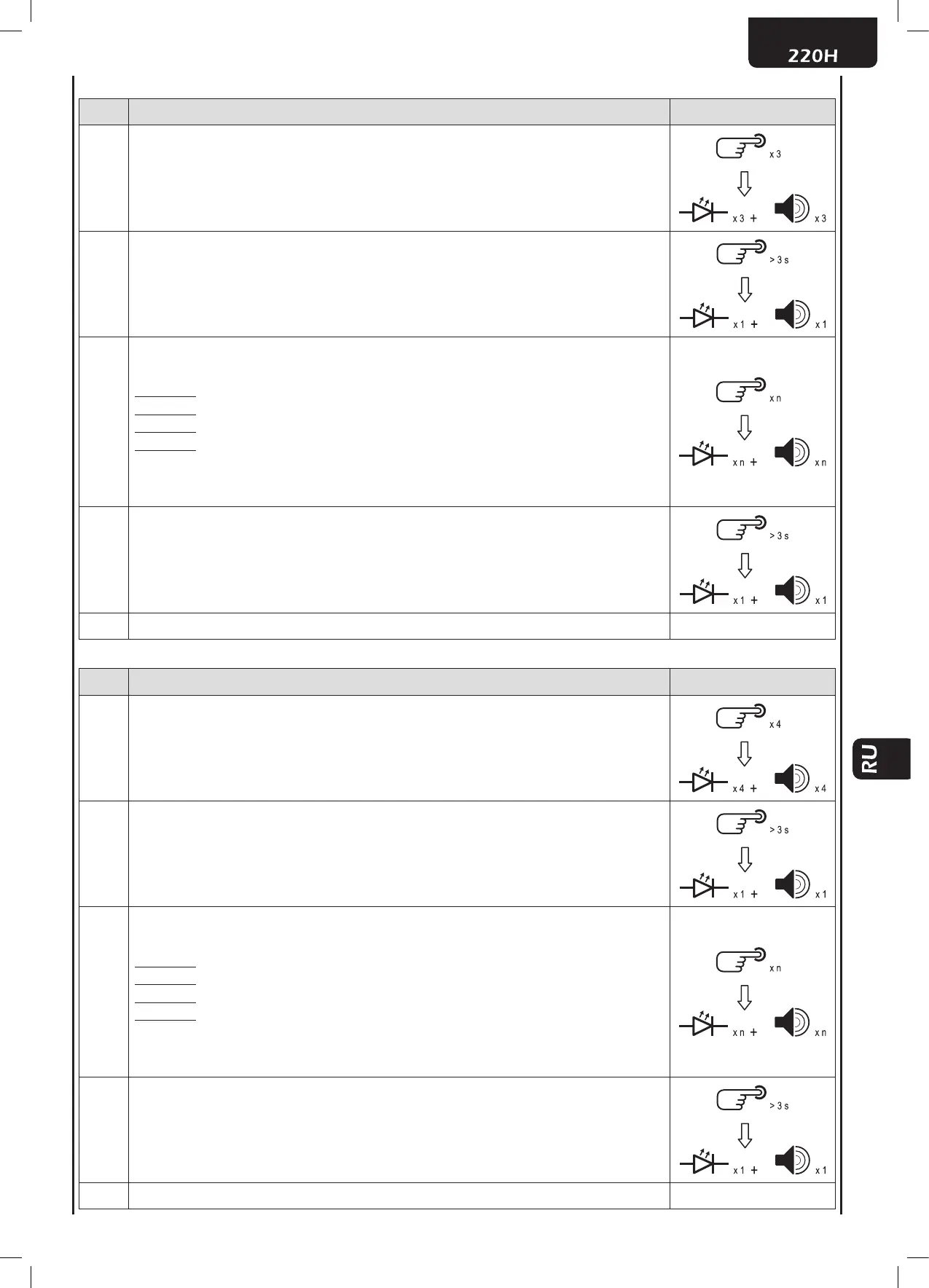 3 нажатия -> С выдержкой времени (3 мигания и 3 звуковых сигнала)