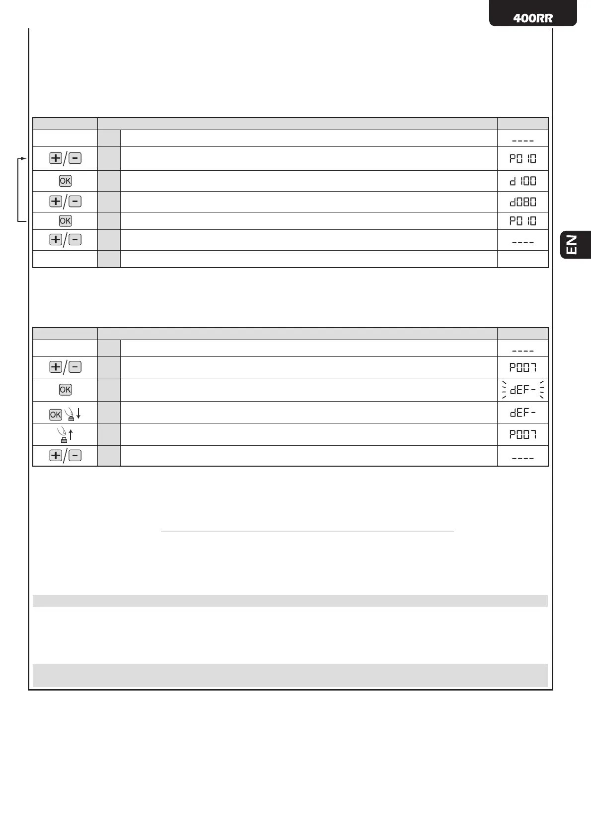 WARNING in case of operators without encoder (P034=1) the speed adjustment and the anti-crush device are not activated.