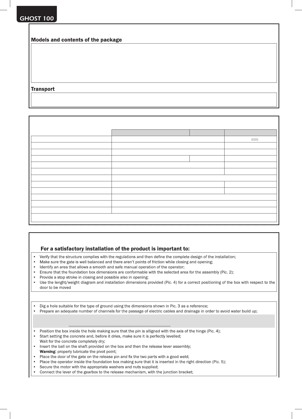 • Use the lenght/weight diagram and installation dimensions provided (Pic. 4) for a correct positioning of the box with respect to the