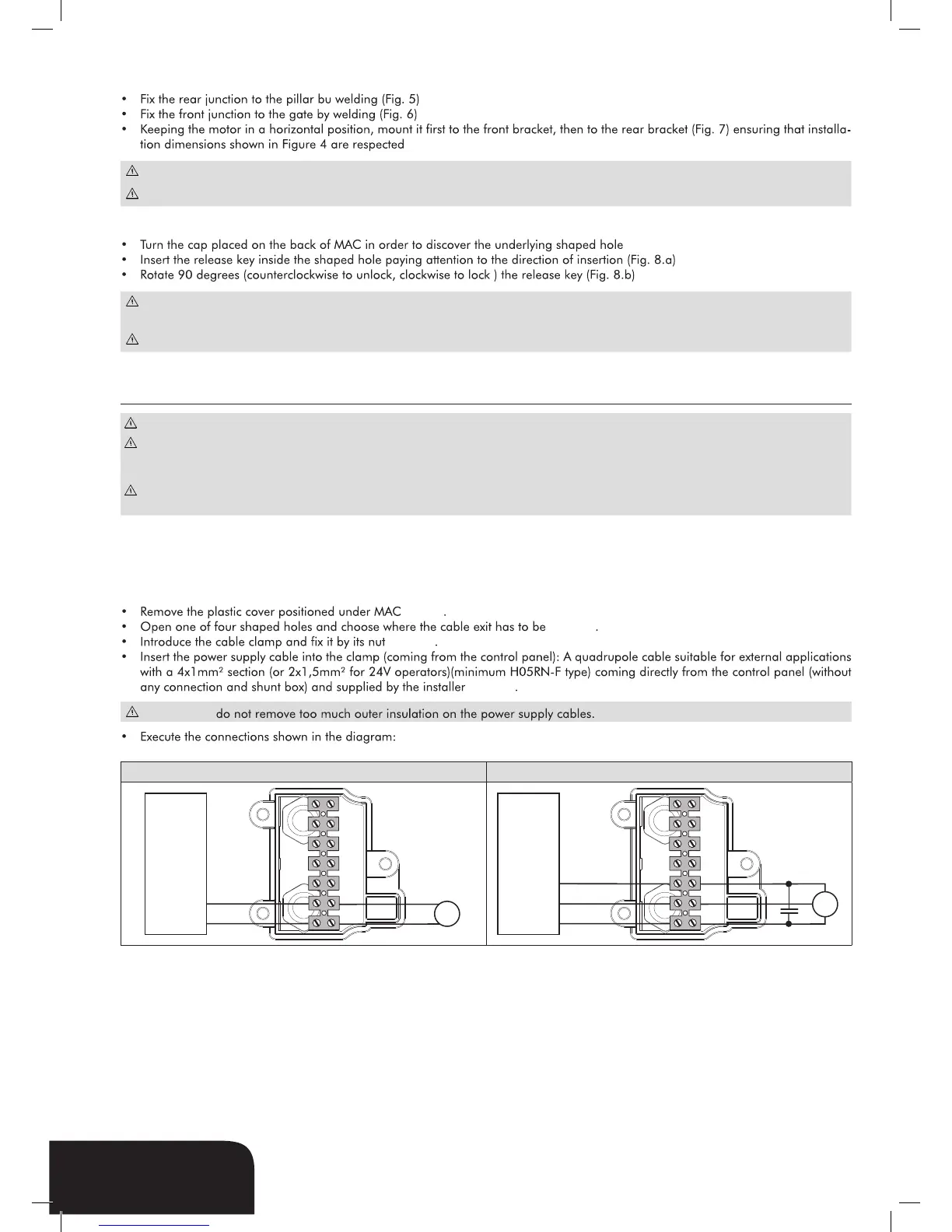 with a 4x1mm² section (or 2x1,5mm² for 24V operators)(minimum H05RN-F type) coming directly from the control panel (without