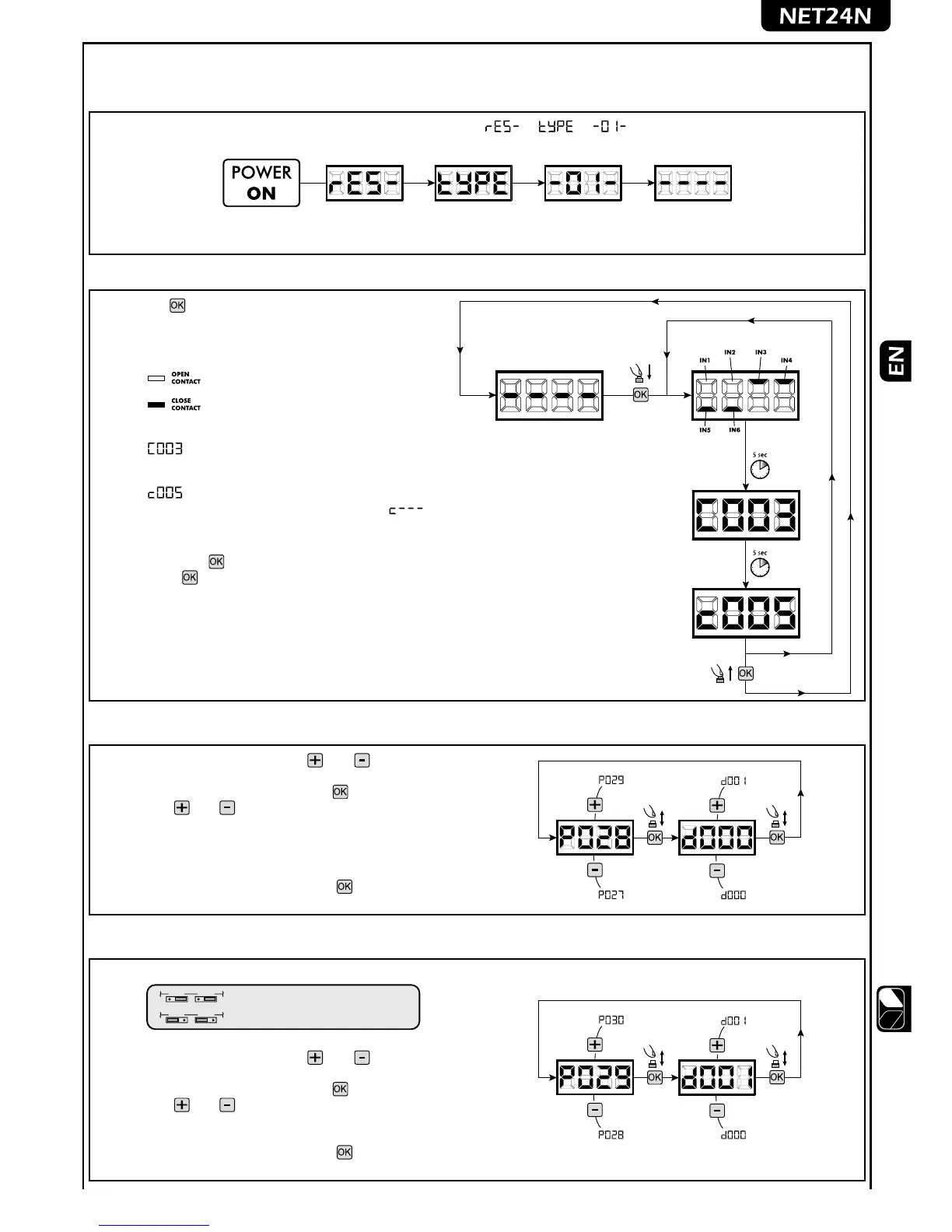 Dare alimentazione, sul display compaiono in sequenza le scritte “ ”, “ ”, “ ” seguite dal simbolo di cancello chiuso