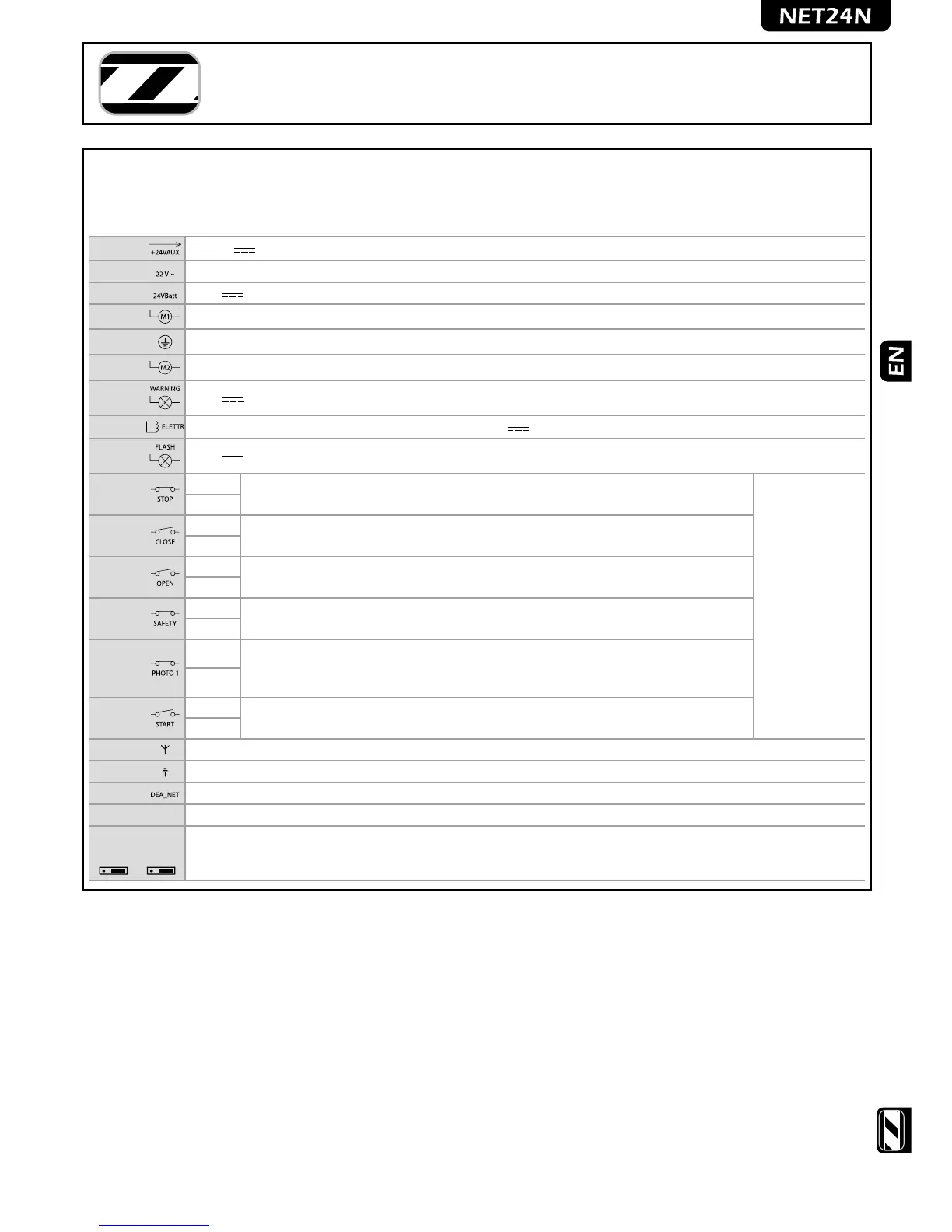 24 V max 15 W output for open gate fix/flashing warning light (if P052=0/1) or courtesy light (if P052>1)