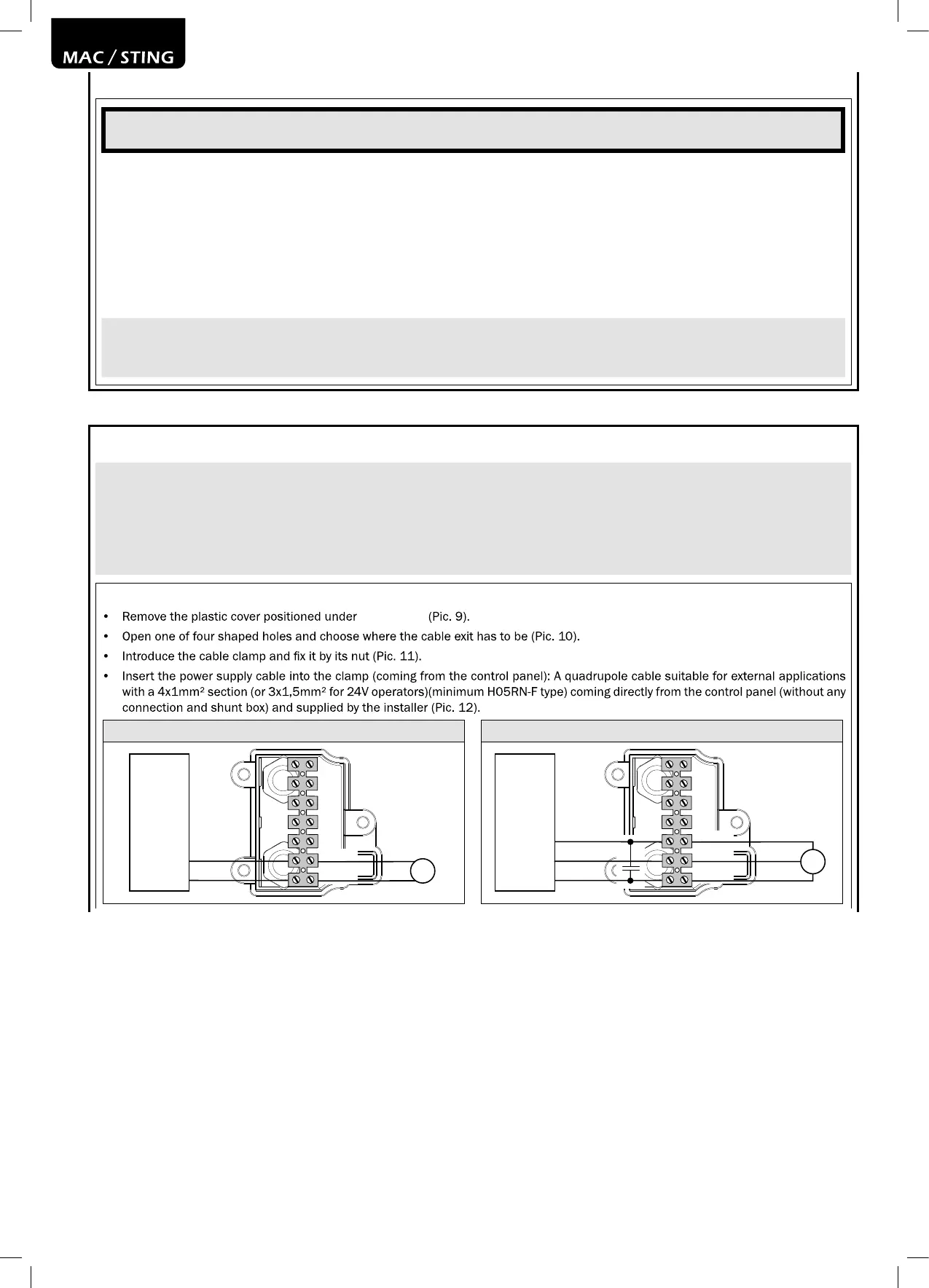 WARNING During the connection phase, fasten the electric cables with appropriate clamps near the terminal boards and, when possible,