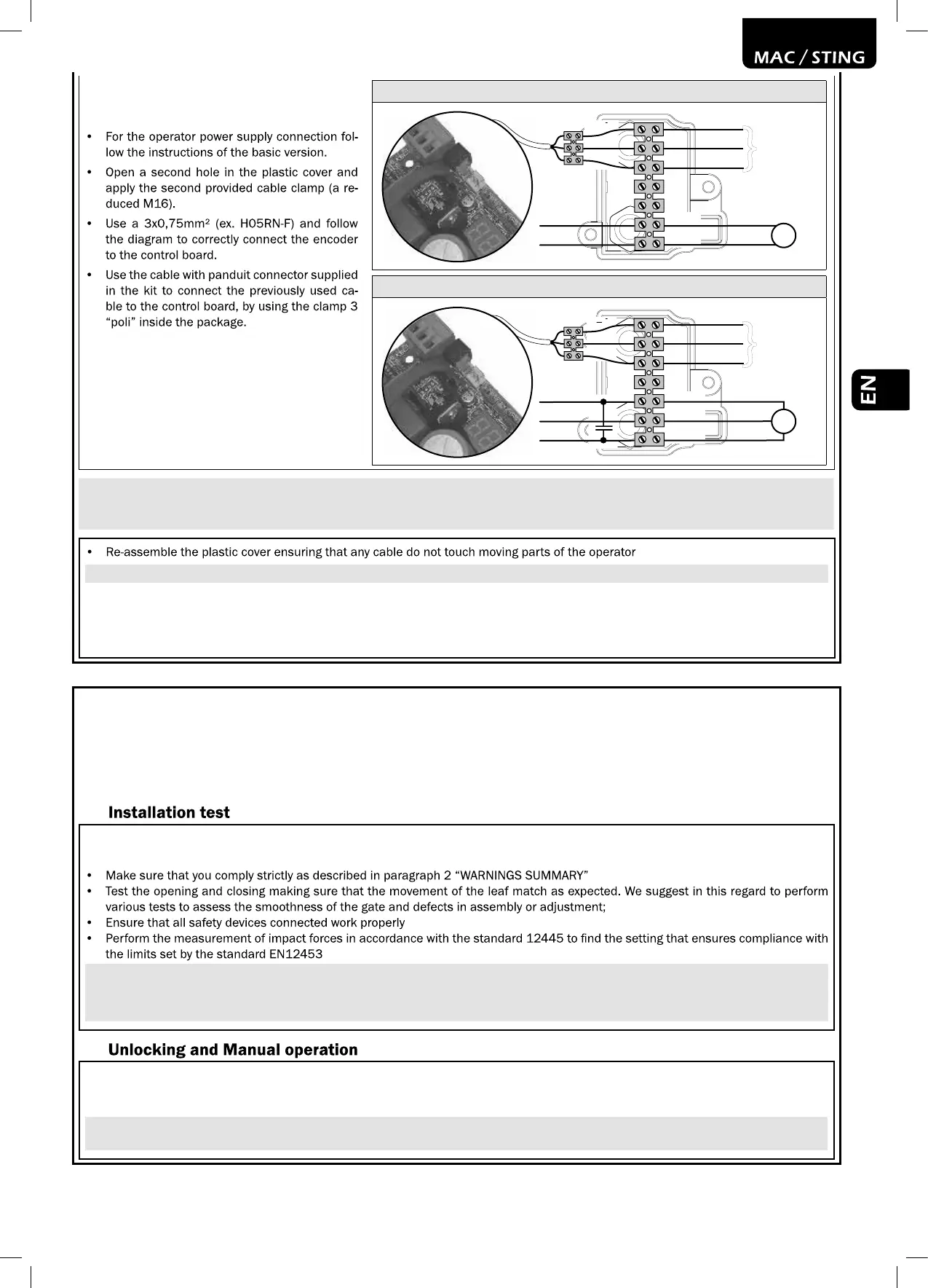 Re-assemble the plastic cover ensuring that any cable do not touch moving parts of the operator .