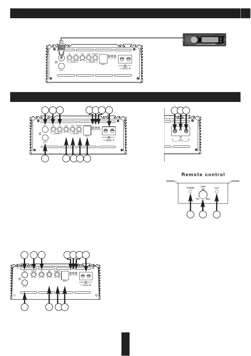 13. REMOTE - вход подключения дистанционного регулятора баса