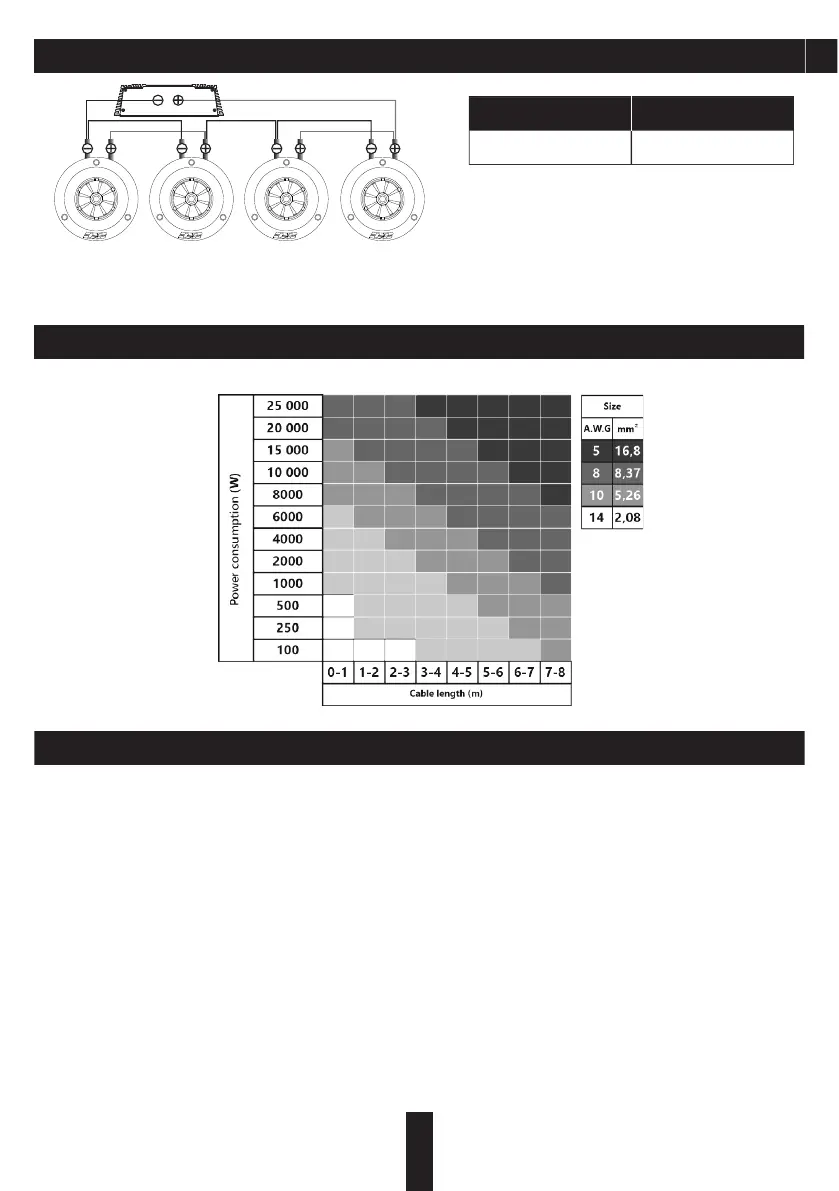 Use the table below to select the desired diameter based on the length and the power consumption.
