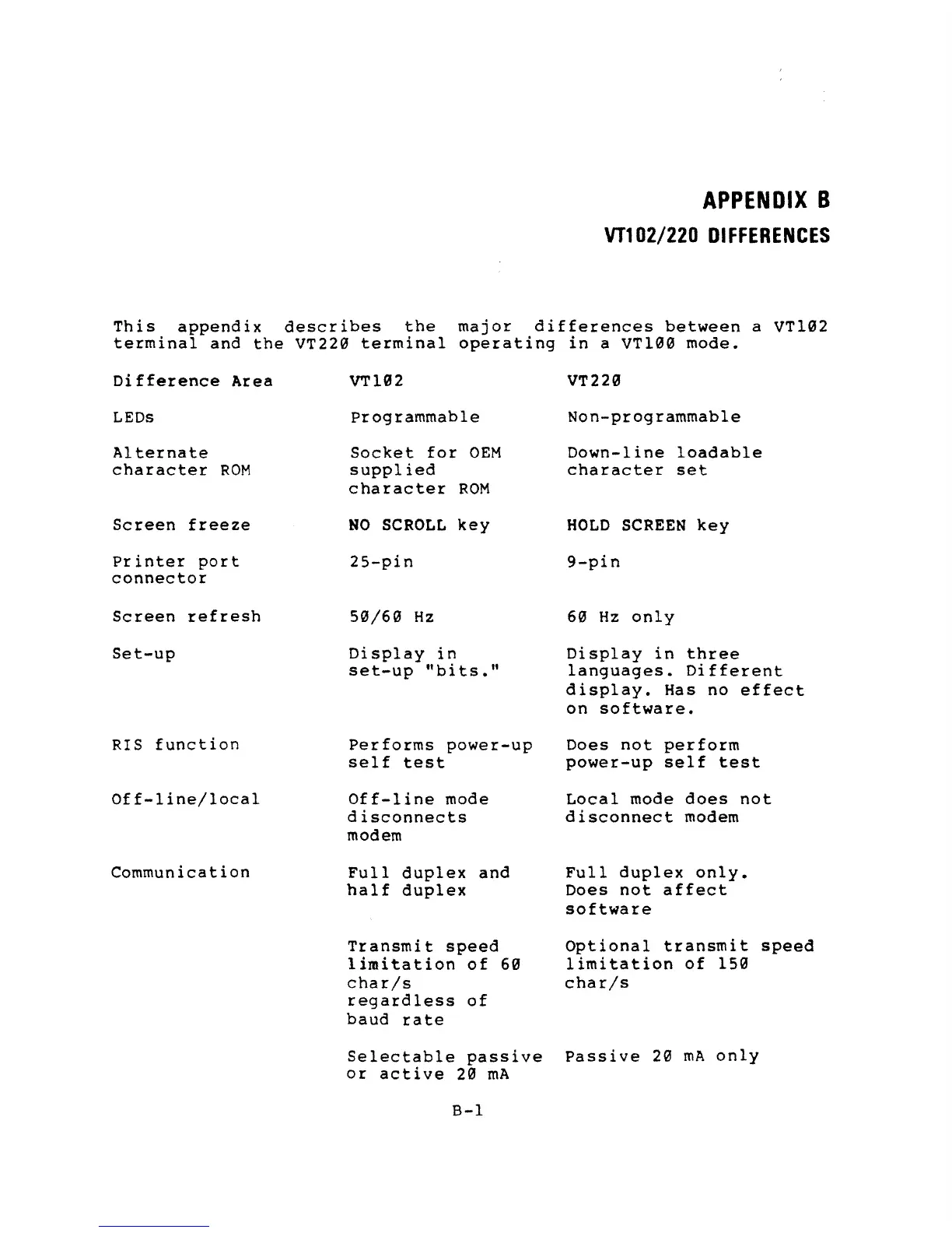 DEC VT220 - Appendix B: VT102220 Differences; Difference Area; VT102; VT220