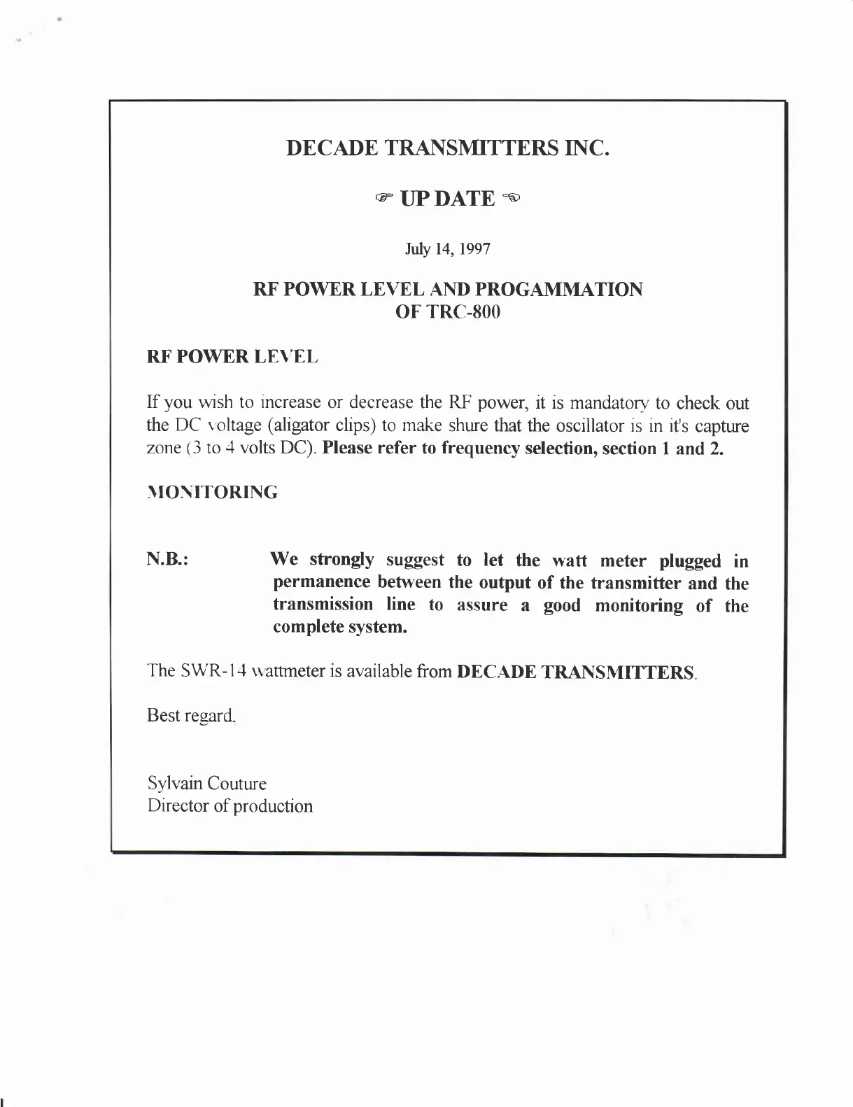 Decade TRC-800 - RF POWER LEVEL AND PROGRAMMATION OF TRC-800; RF POWER LEVEL; MONITORING