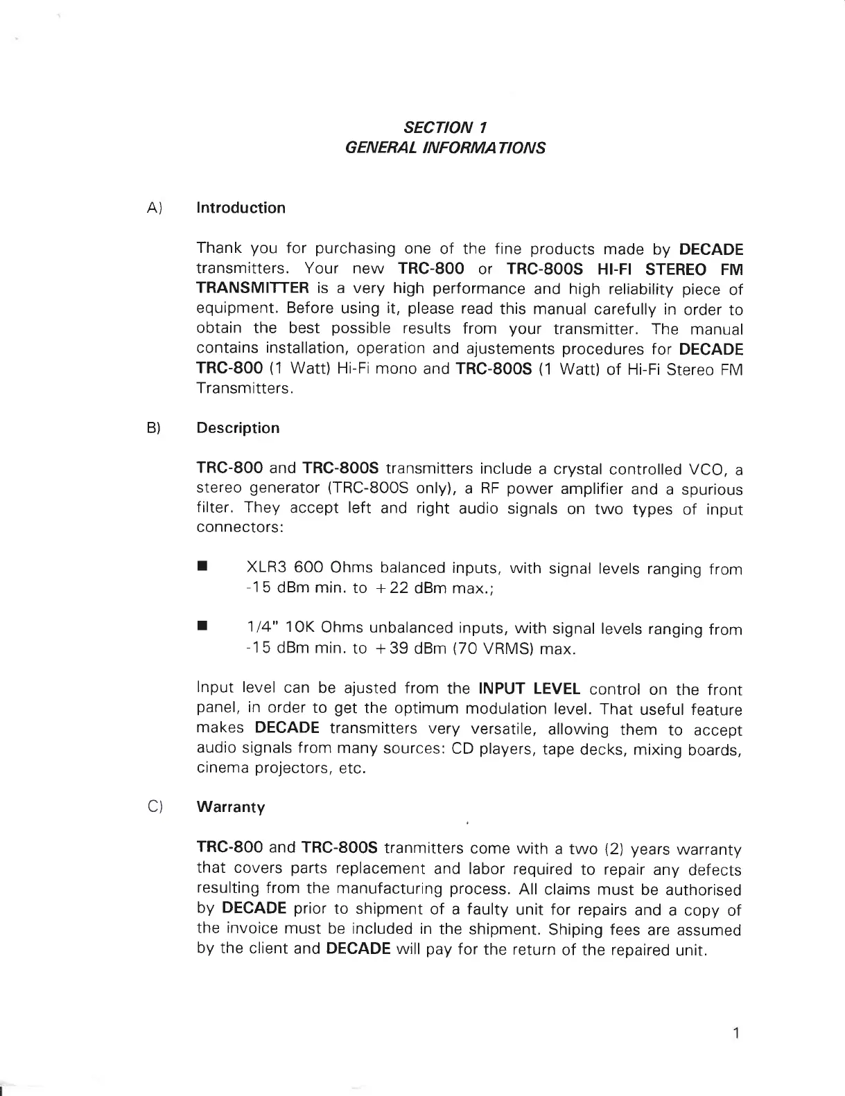Decade TRC-800 - SECTION 1: GENERAL INFORMATIONS; Introduction; Description; Warranty