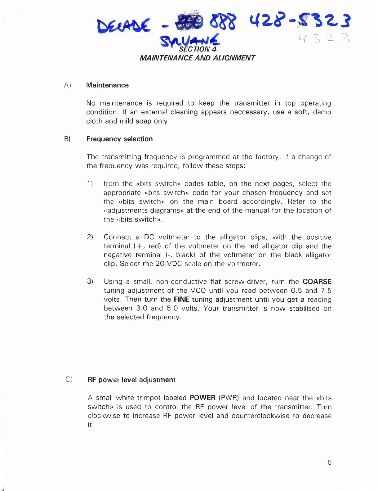 Decade TRC-800 - SECTION 4: MAINTENANCE AND ALIGNMENT; Maintenance; Frequency selection; RF power level adjustment