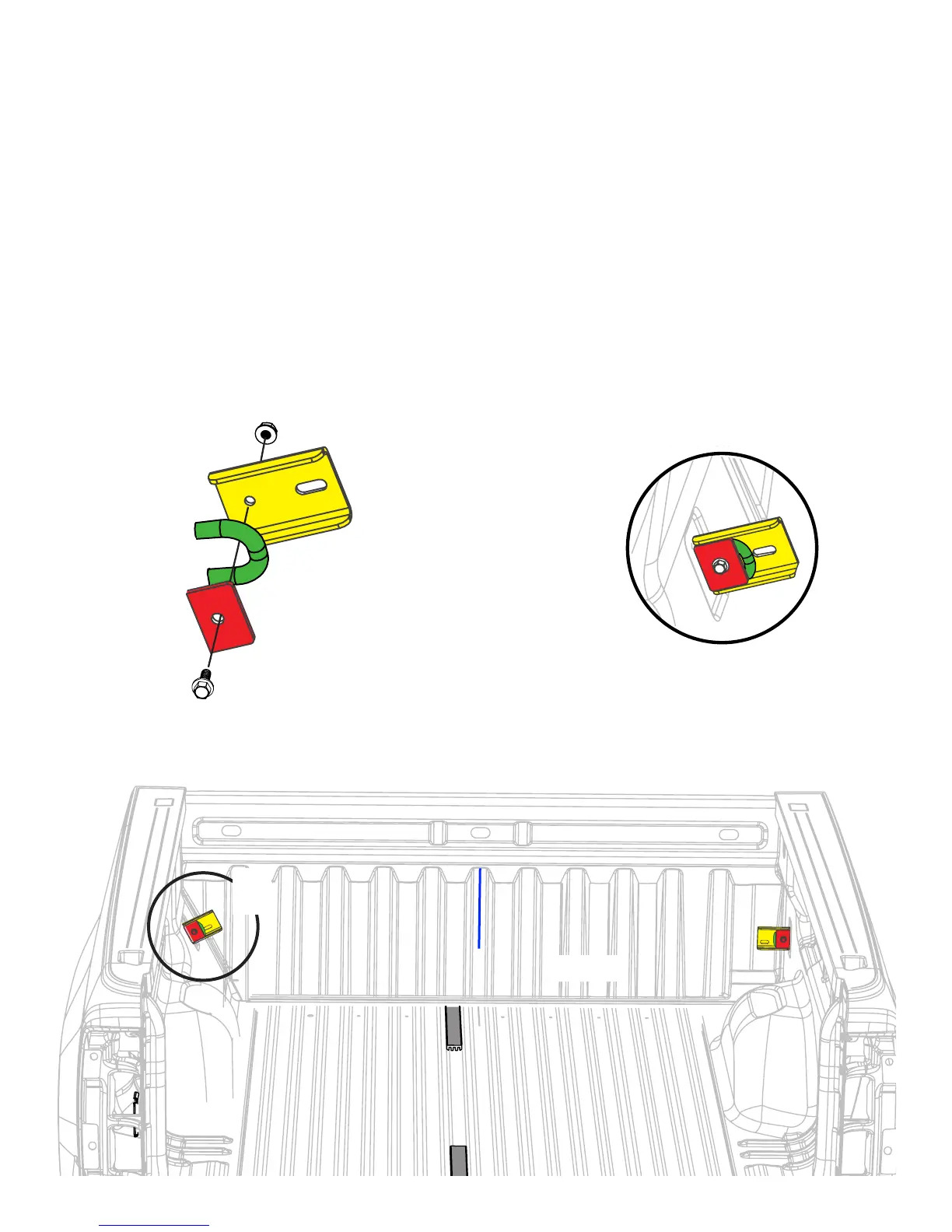 Sandwich the factory driver side tie-down (green) in between the cabside tie-down bracket (yellow) and the clamp