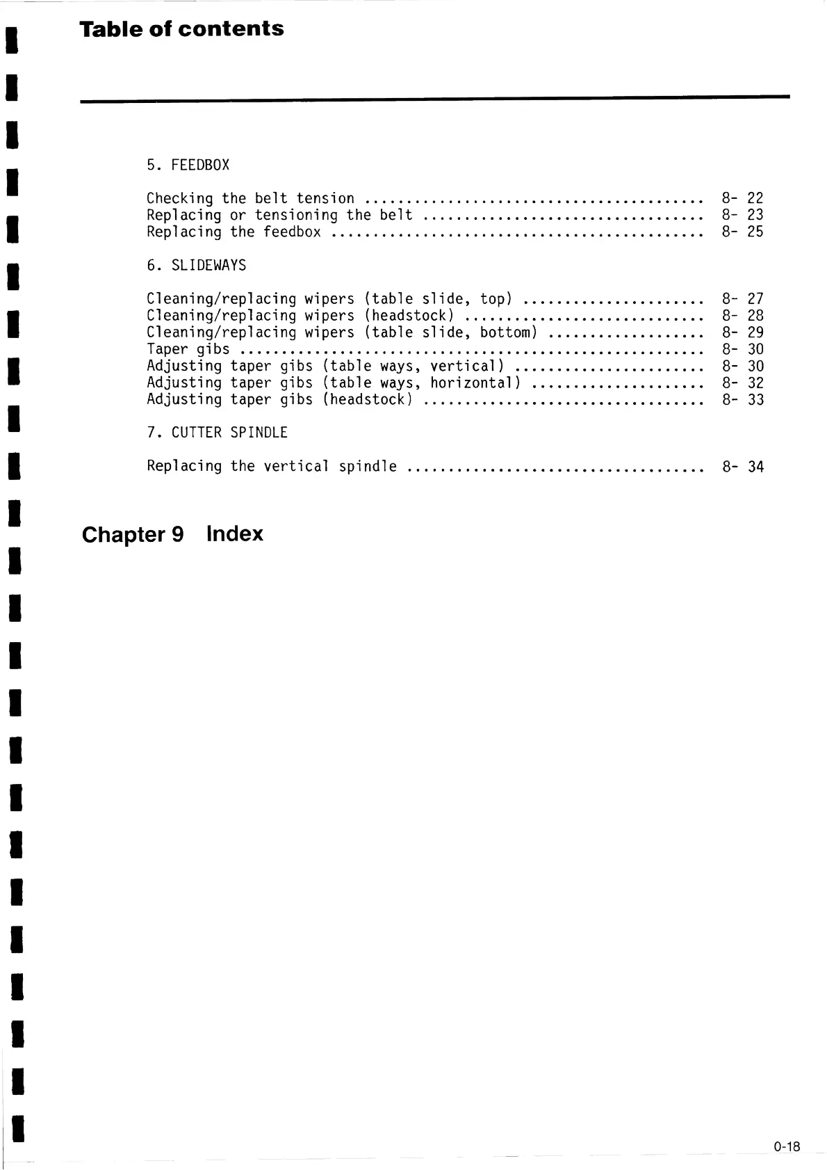 Adjusting taper gibs (table ways, vertícal) ...................... 8- 30