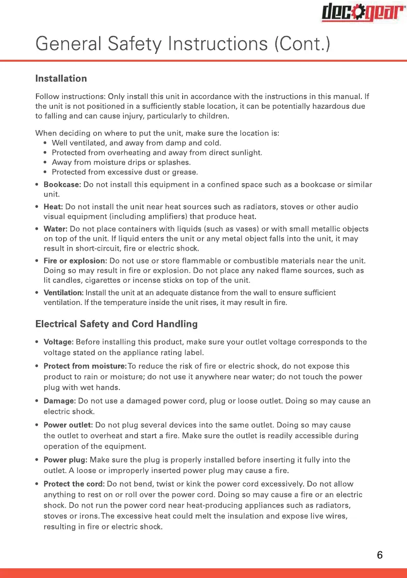 Deco Gear DGVIEW201 - Monitor Installation Safety; Electrical Safety and Cord Handling