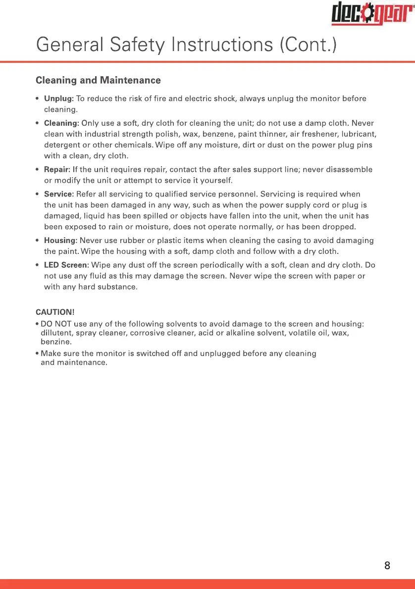 Deco Gear DGVIEW201 - Cleaning and Maintenance