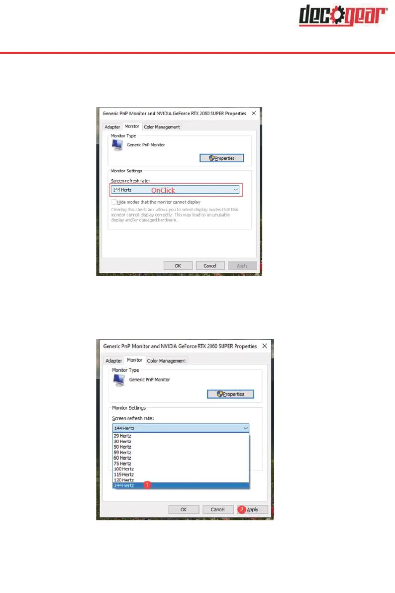 6. Select the refresh rate which you like, Then click the “Apply” (Pls see the below picture)