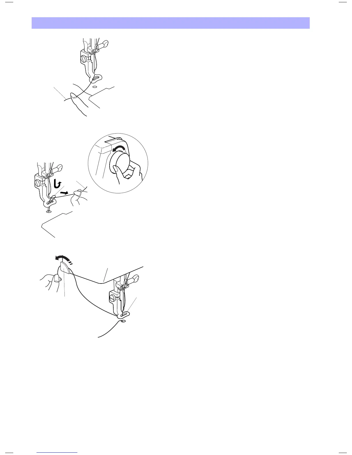 Raise the presser foot lifter. Hold the needle thread with your finger.