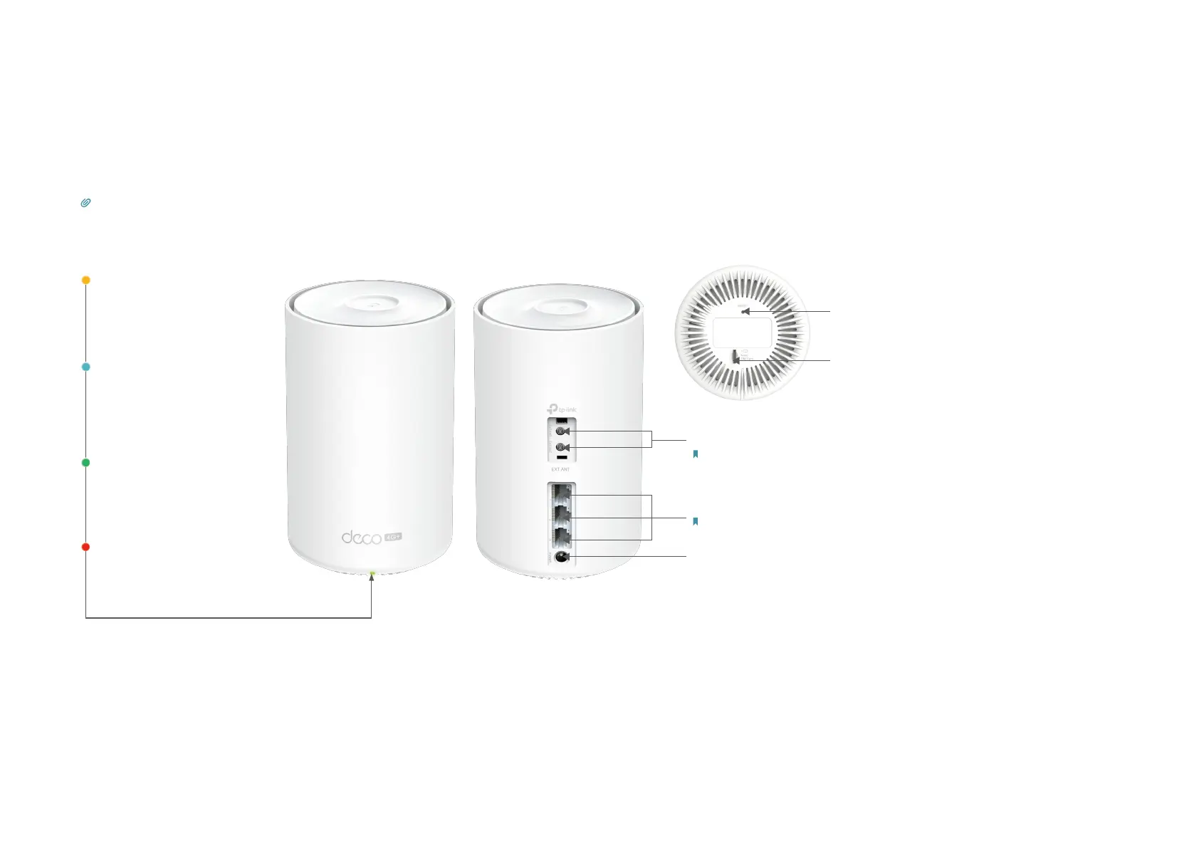 Each Deco has an LED that changes color according to its status, three RJ-45 Ethernet ports, two external antennas port, a SIM card slot, a power slot,