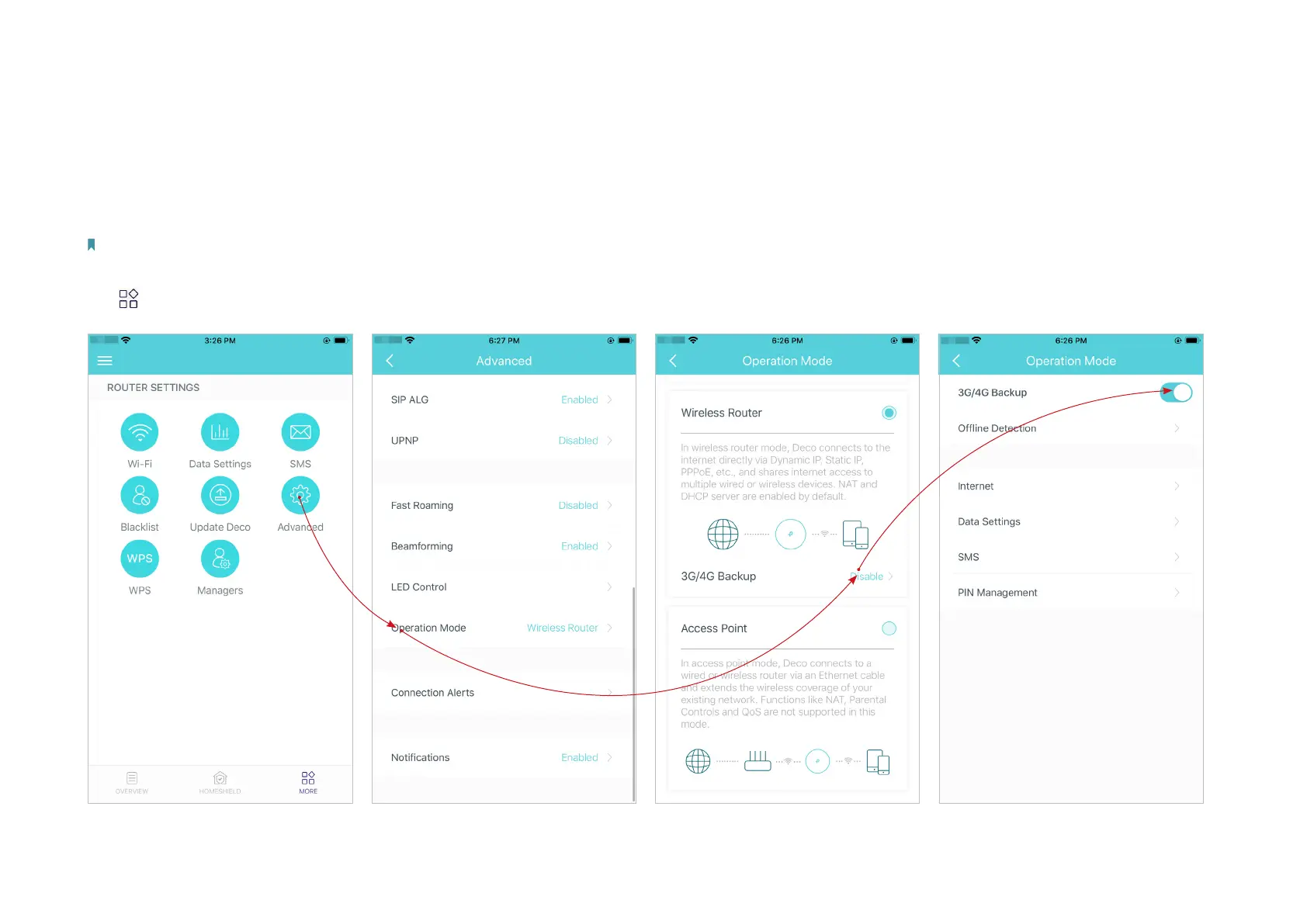 Tap > Advanced > Operation Mode > 3G/4G Backup and enable 3G/4G Backup.