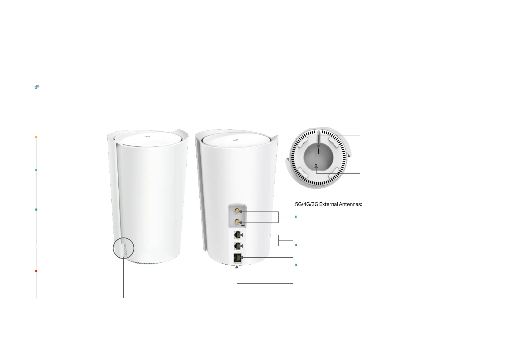 Each Deco has an LED that changes color according to its status, three RJ-45 Ethernet ports, two external antennas port, a SIM card slot, a power slot,