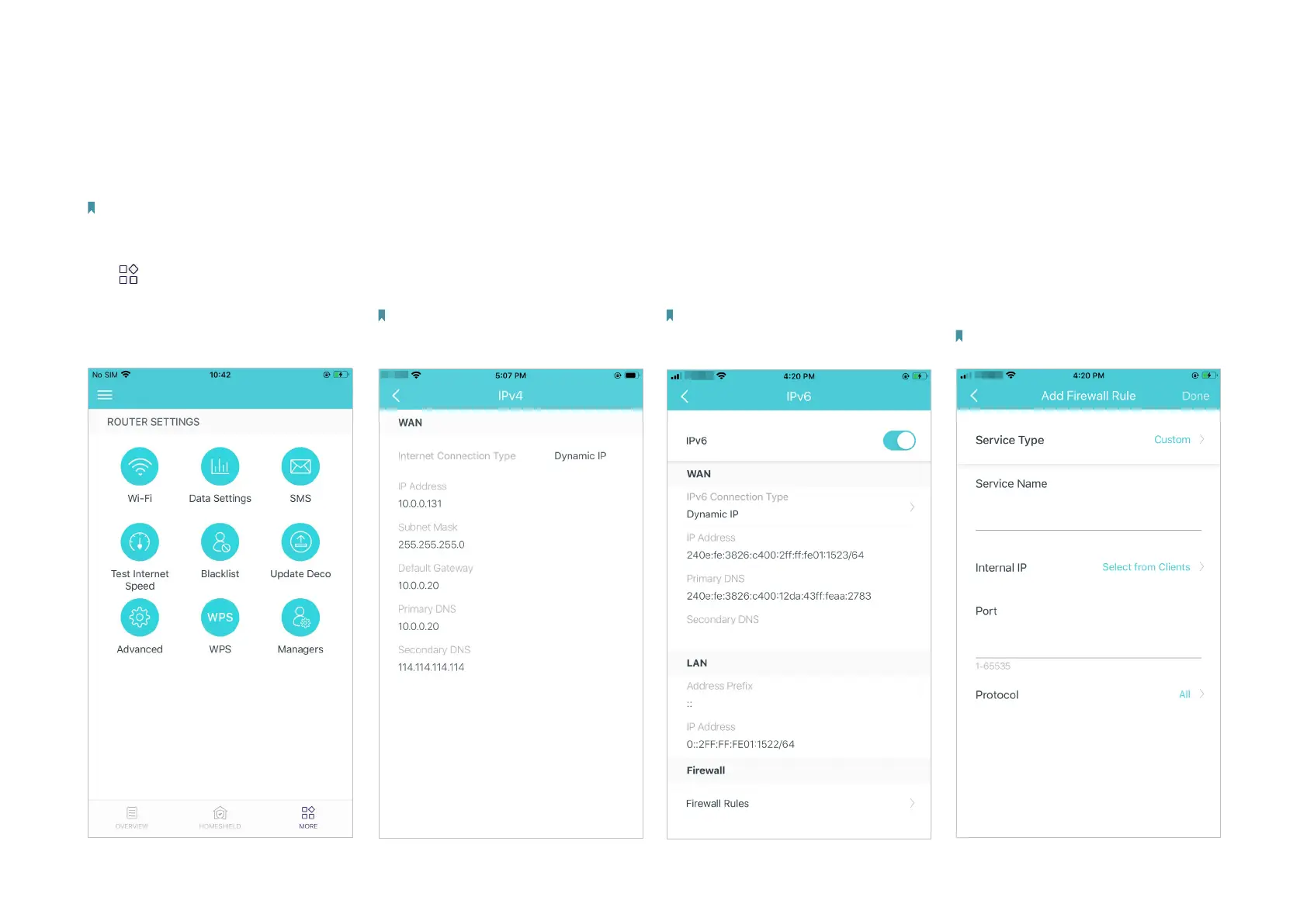 works in Wireless Router mode and being remotely controlled from the Deco app, IPv4, IPv6, VLAN/IPTV, 4G/5G Backup and Oine Detection are not available.