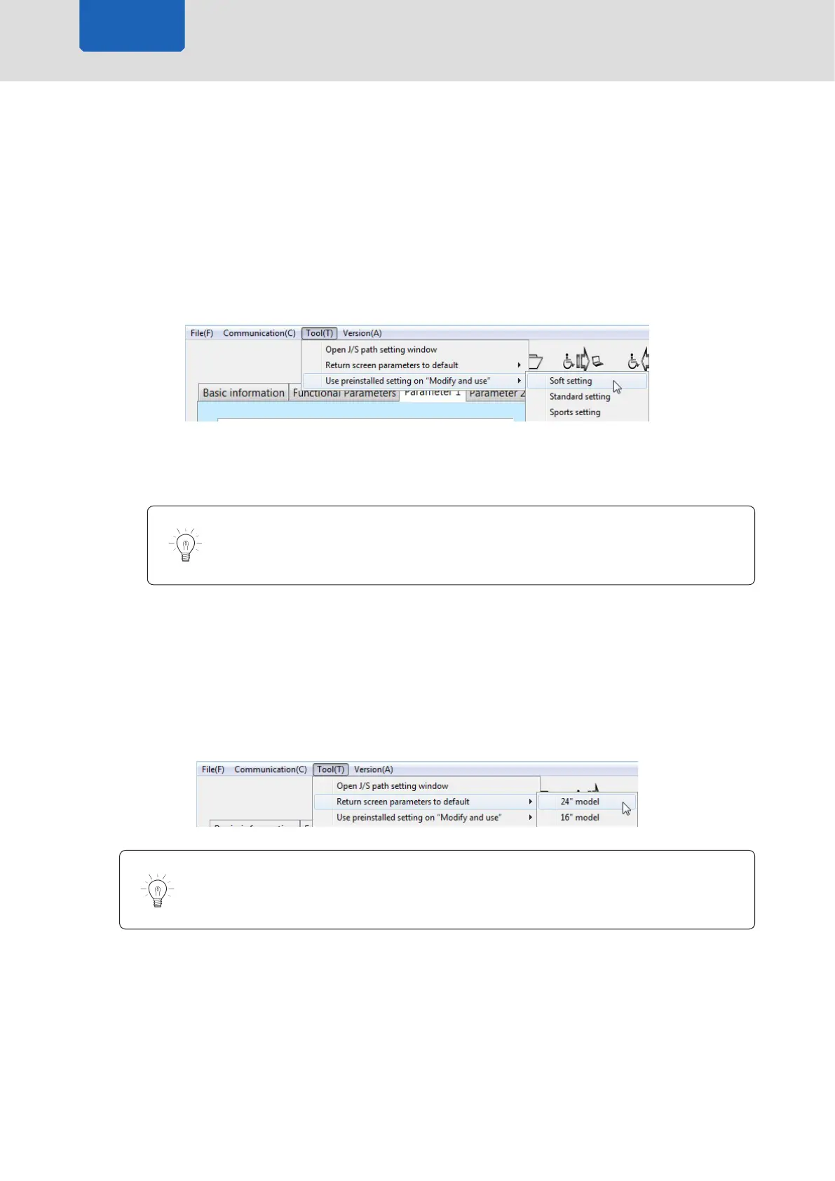 to display the factory preset values of the 24" model or the 16" model. Select the settings in