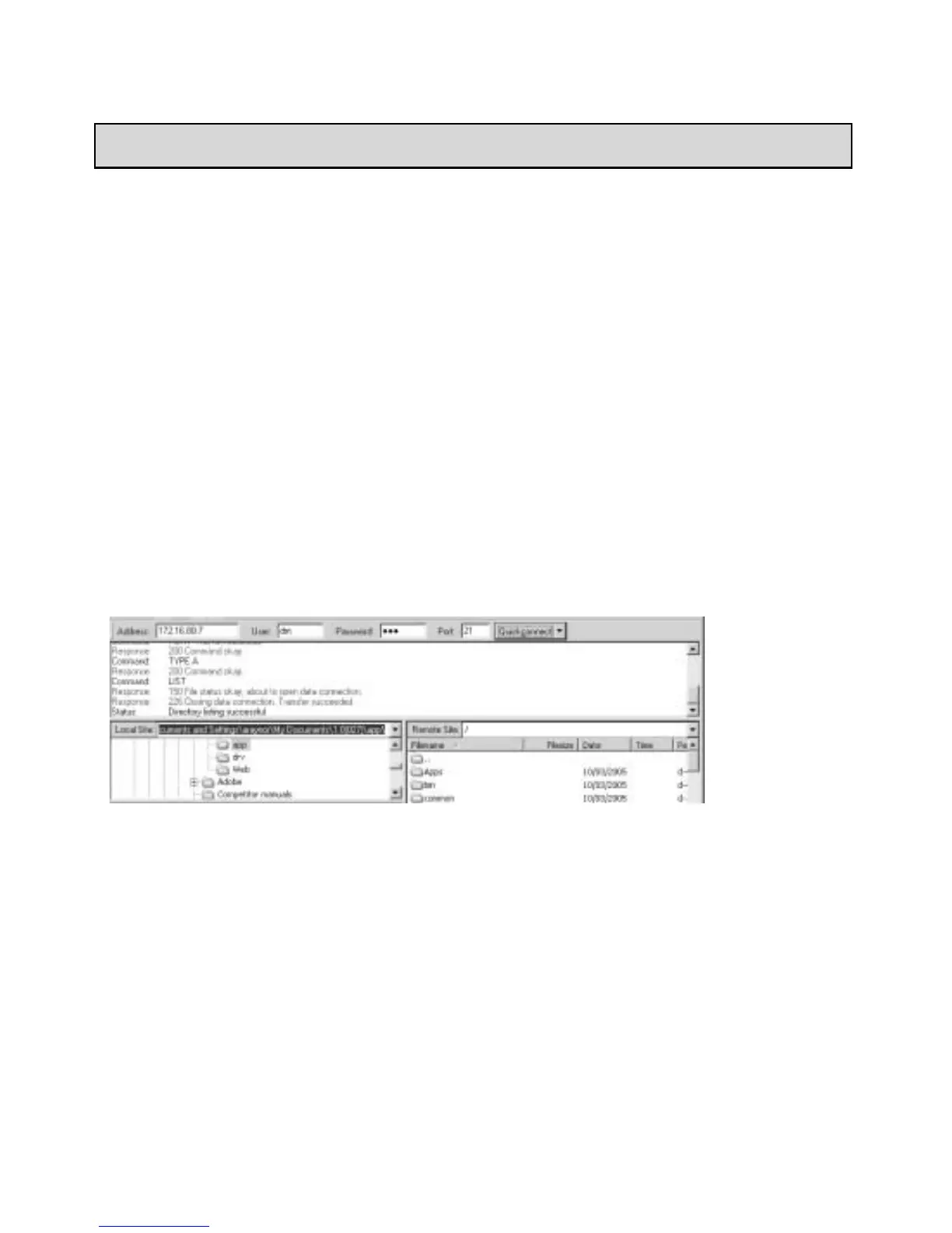 The following steps give an example of how to create an FTP session with the Digital Sprite 2 to