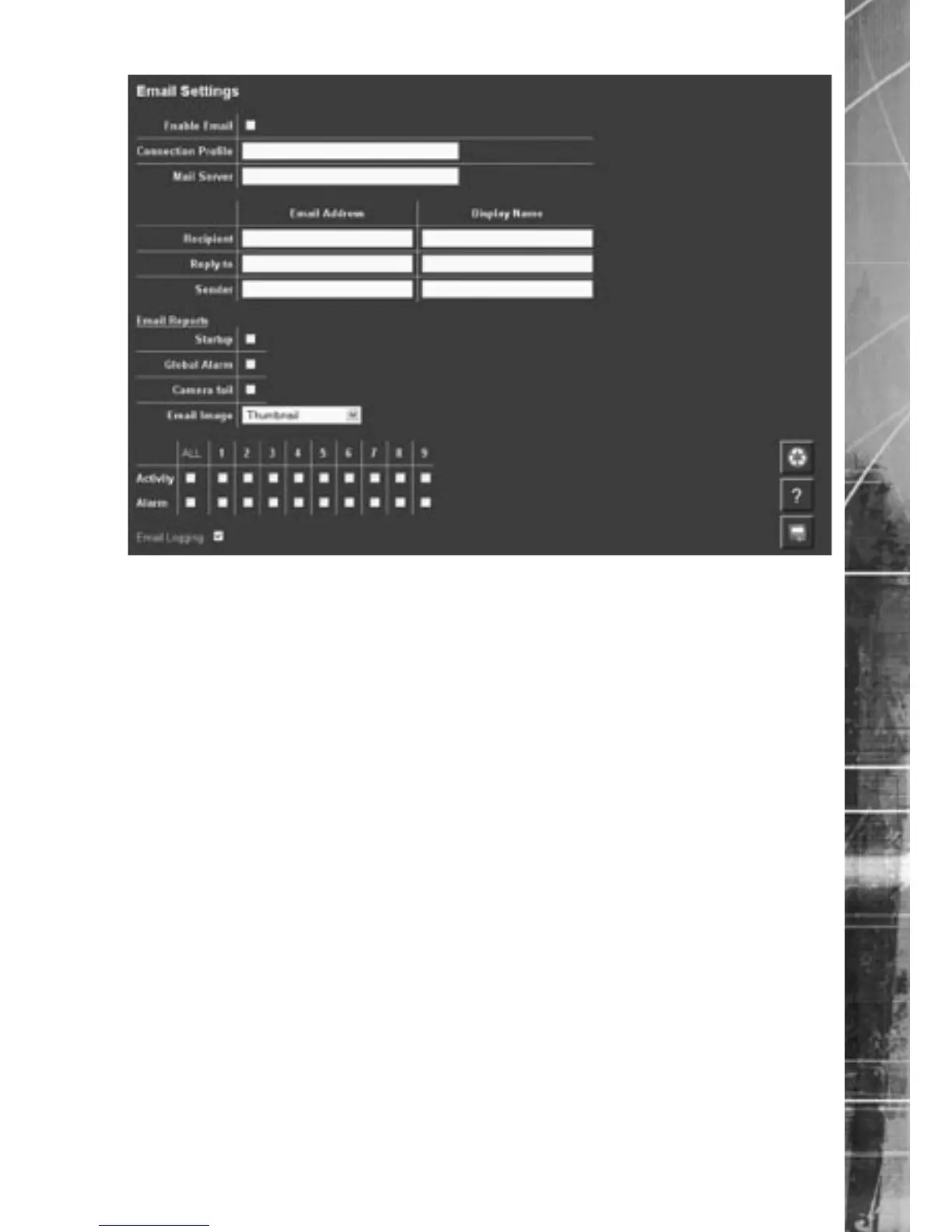 Activity/Alarm Each camera can be individually selected to send an email when