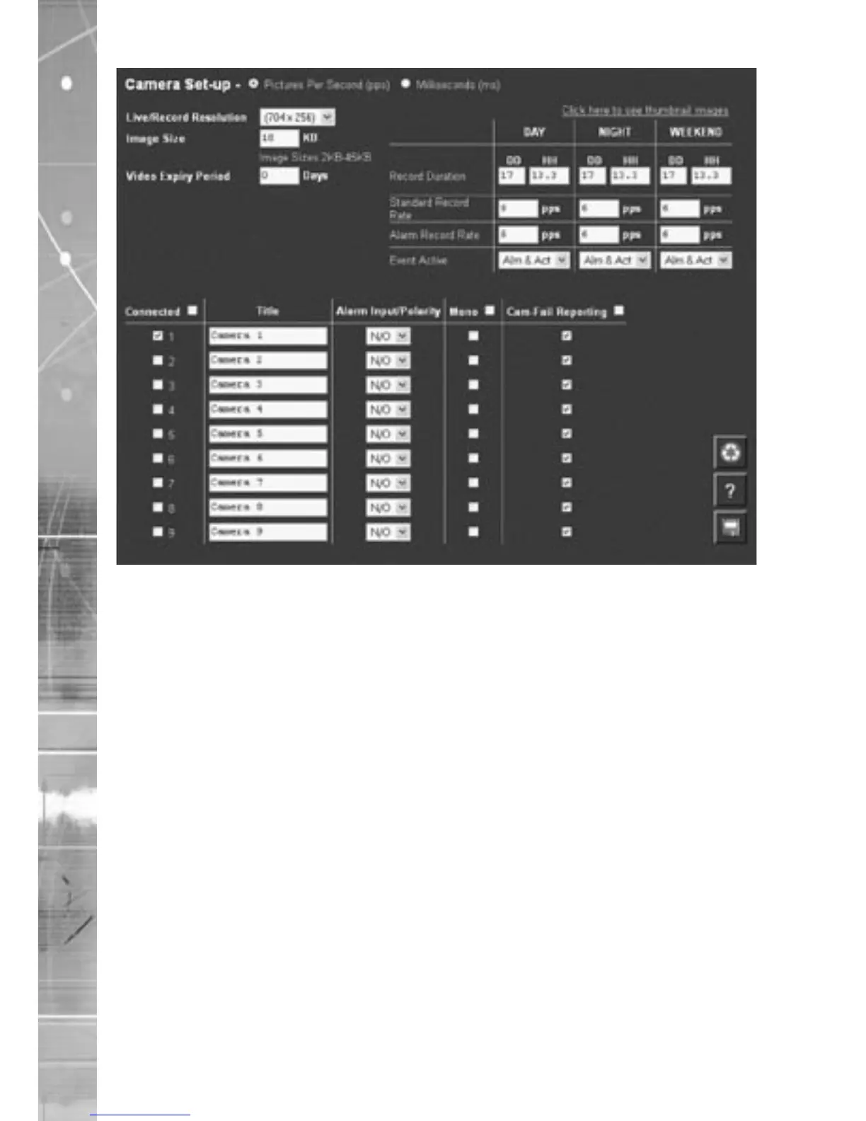 Pictures/Second / milliseconds This allows the record settings to be configured as either Pictures