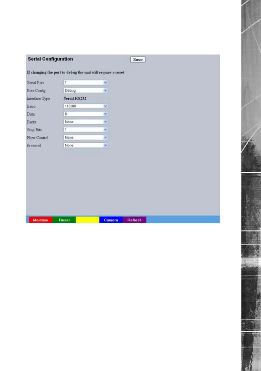 This menu allows conguration of the unit’s Serial ports. Refer to ‘Installing the Unit’ for installation